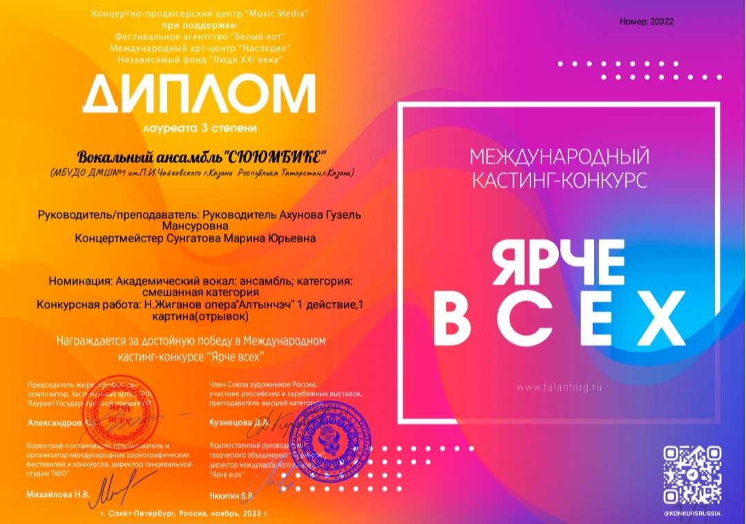 Международный кастинг-конкурс  "Ярче всех" - Вокальный ансамбль "Сююмбике", Лауреат III степени, рук. Ахунова Г.М., концертмейстер Сунгатова М.Ю.;