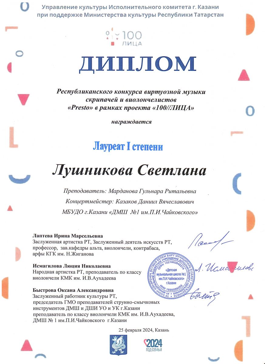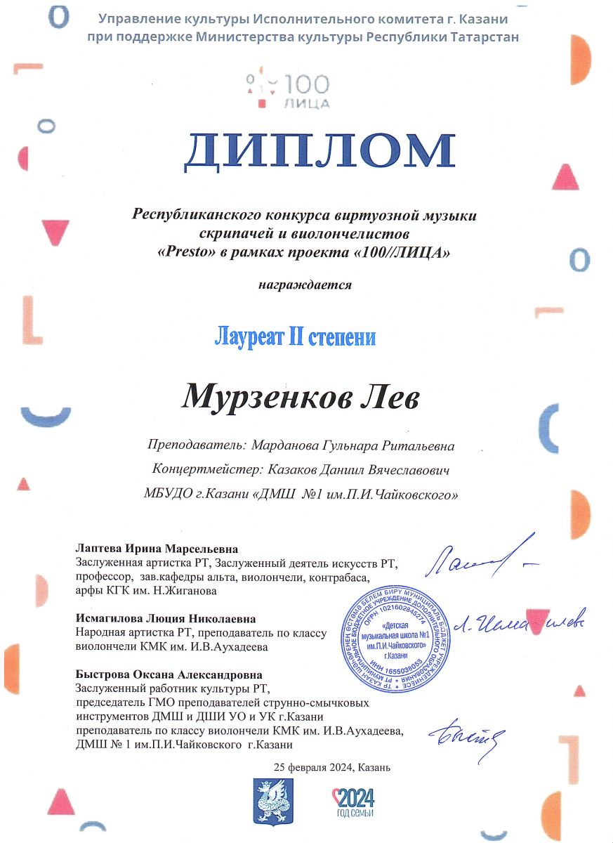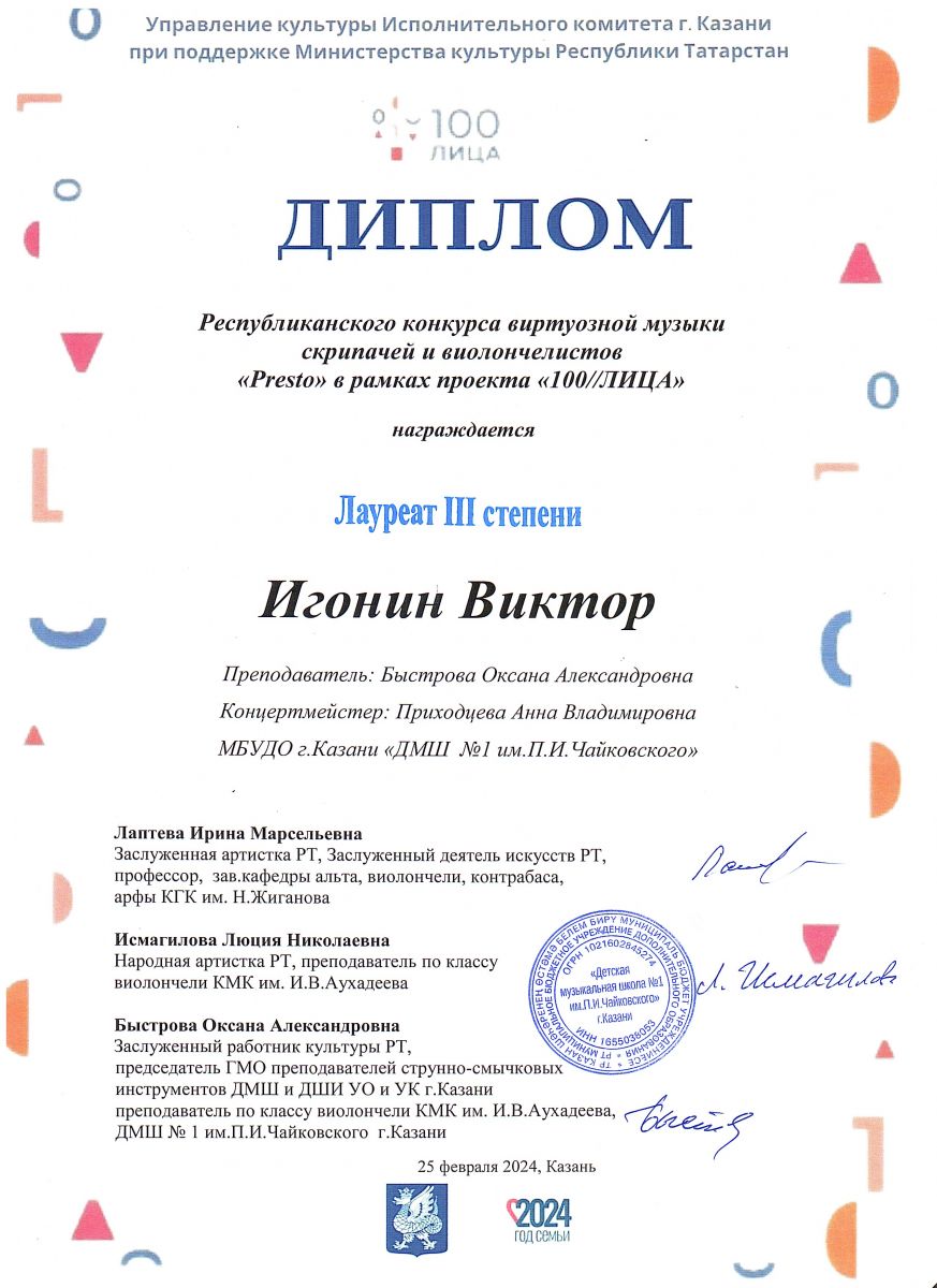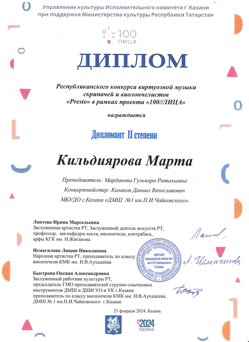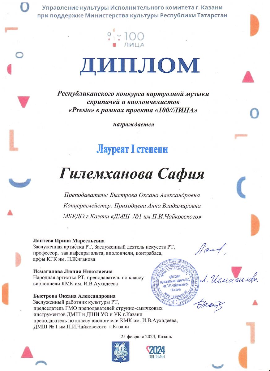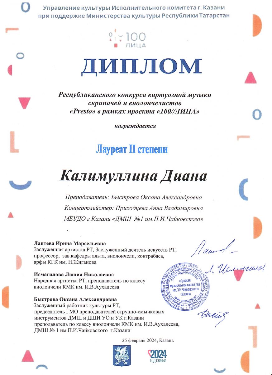 Республиканский конкурс виртуозной музыки скрипачей и виолончелистов "Presto" в рамках проекта 100//ЛИЦА - Лауреат степени, класс Сытиковой Н.А., концертмейстер Мирханов Ф.М.;