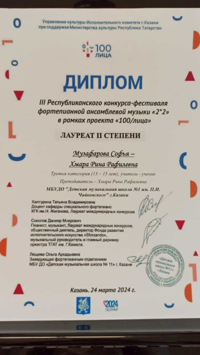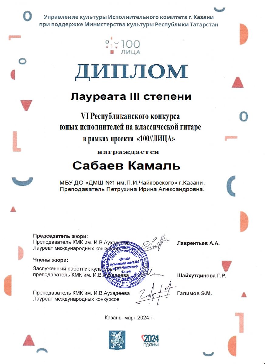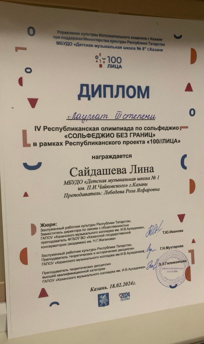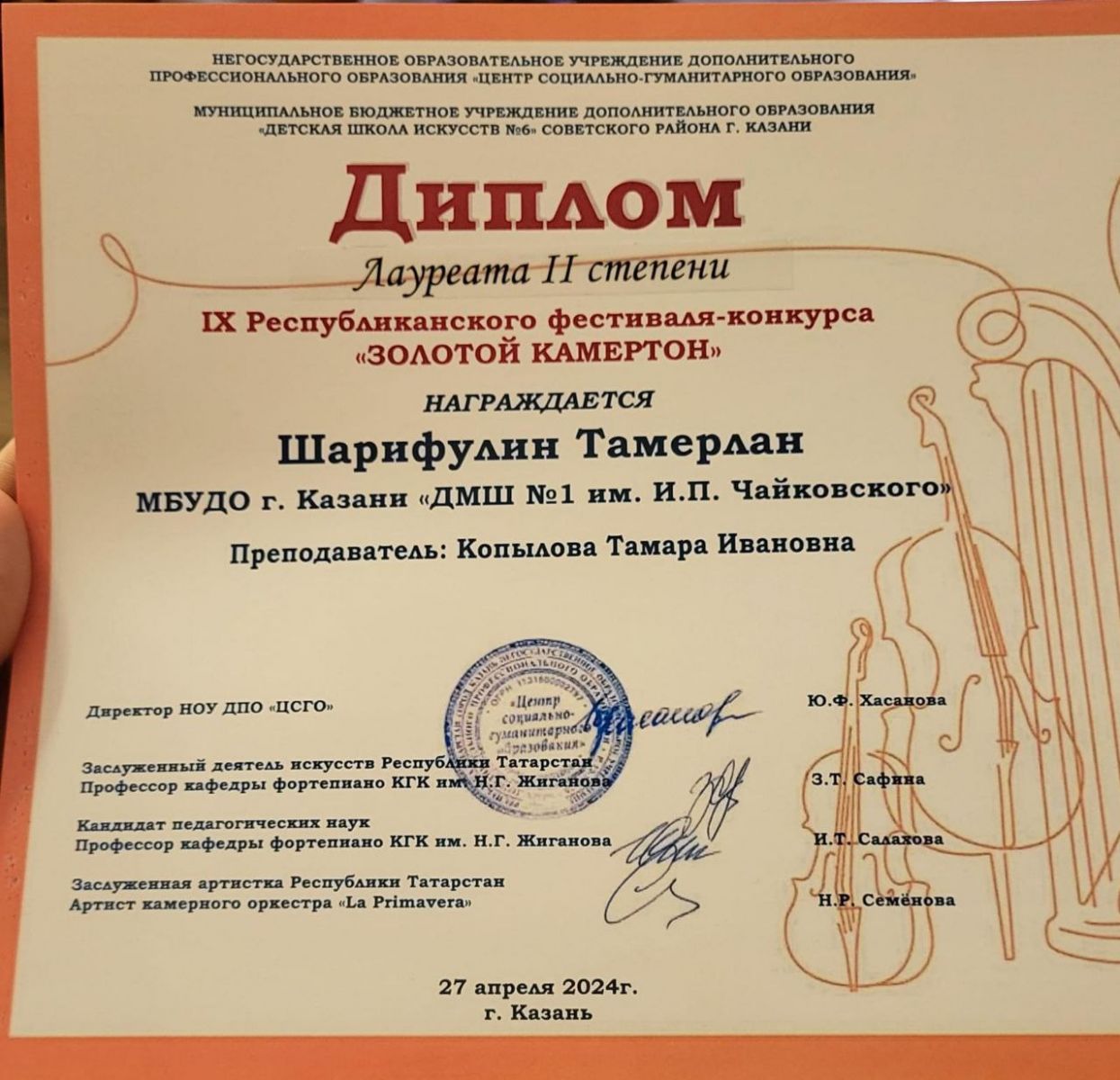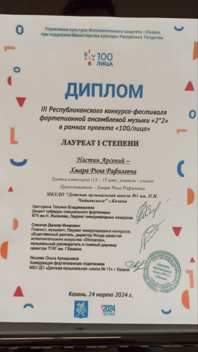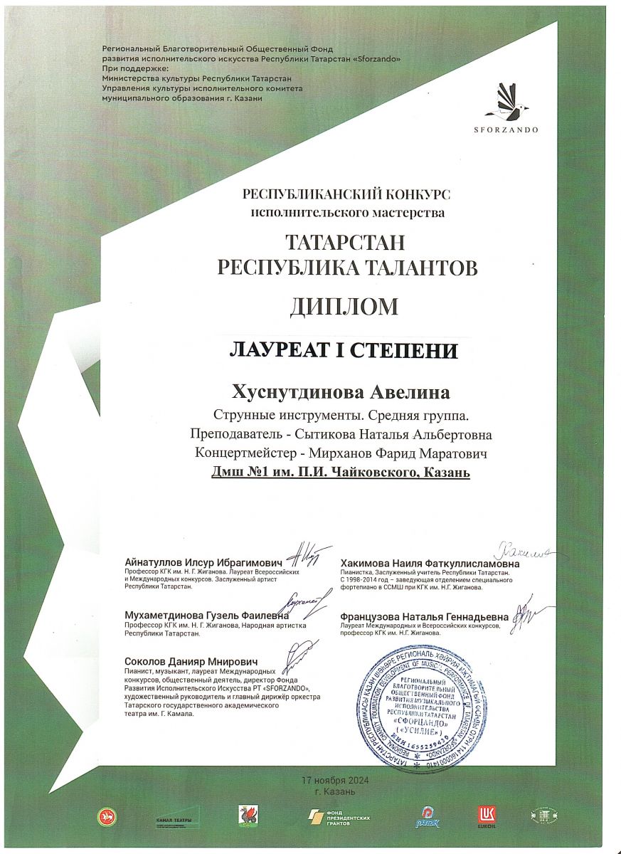 Республиканский конкурс виртуозной музыки скрипачей и виолончелистов "Presto" в рамках проекта 100//ЛИЦА - Лауреат степени, класс Сытиковой Н.А., концертмейстер Мирханов Ф.М.;