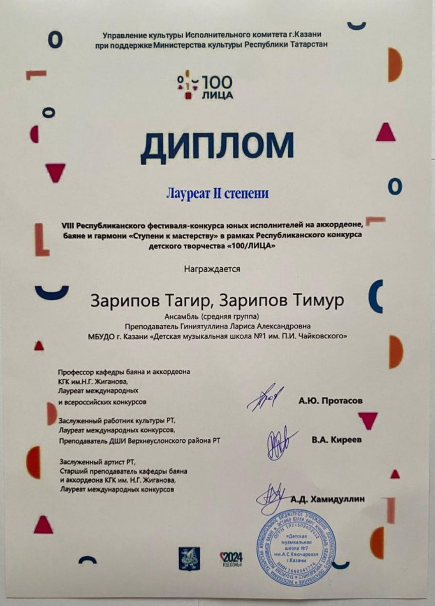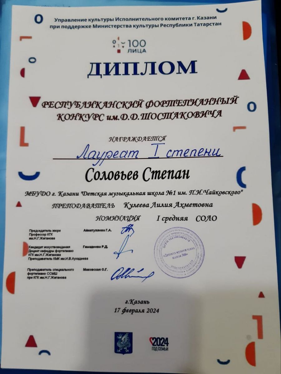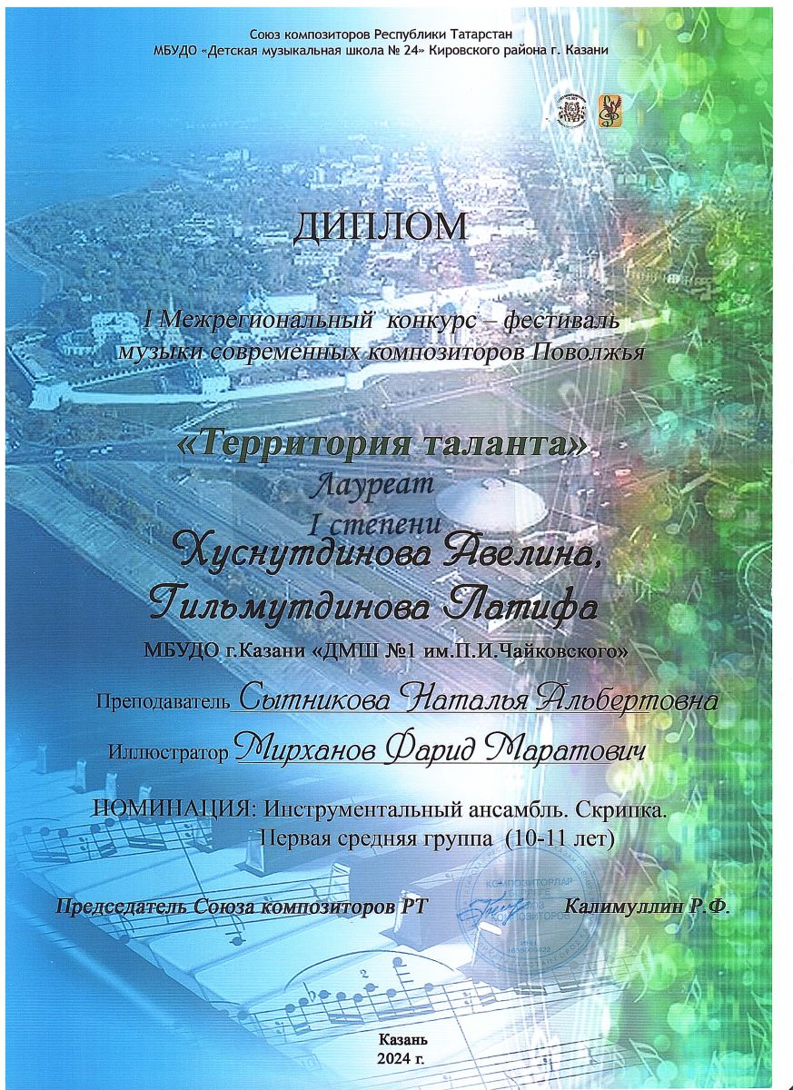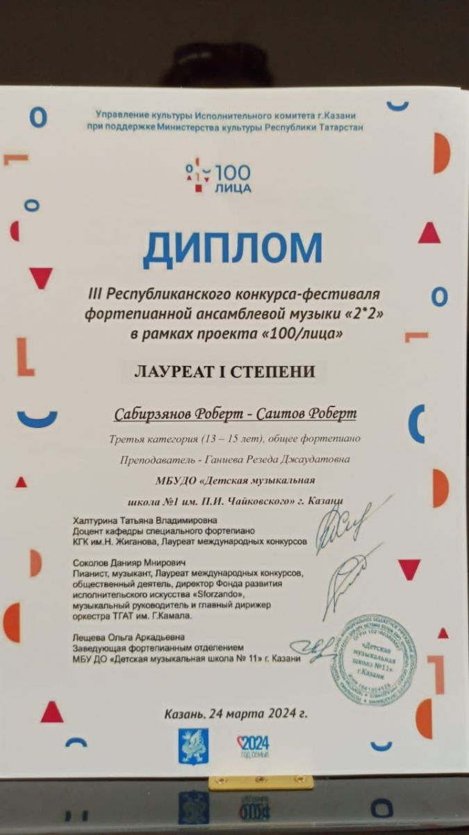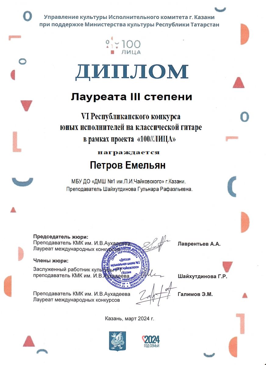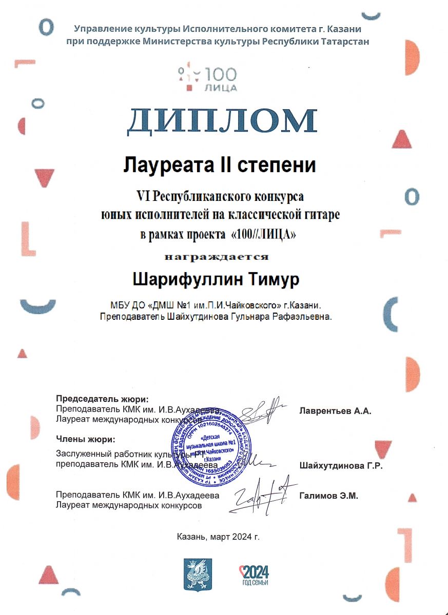 Республиканский конкурс виртуозной музыки скрипачей и виолончелистов "Presto" в рамках проекта 100//ЛИЦА - Лауреат степени, класс Сытиковой Н.А., концертмейстер Мирханов Ф.М.;