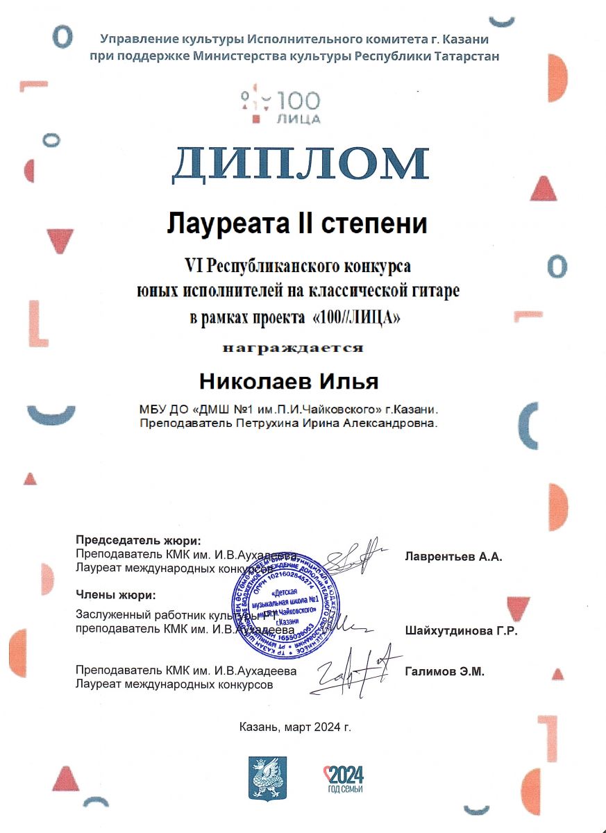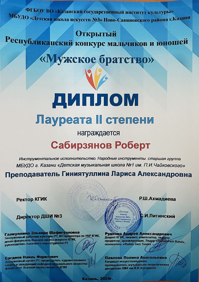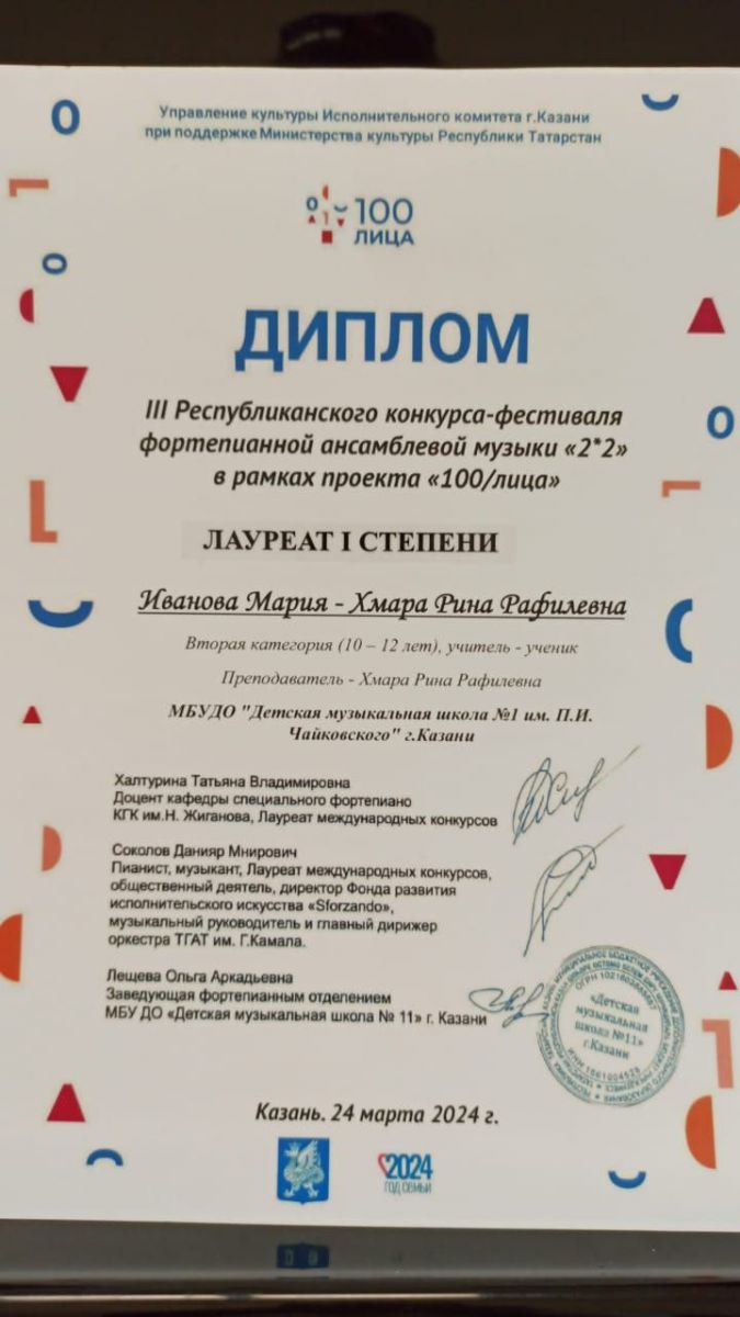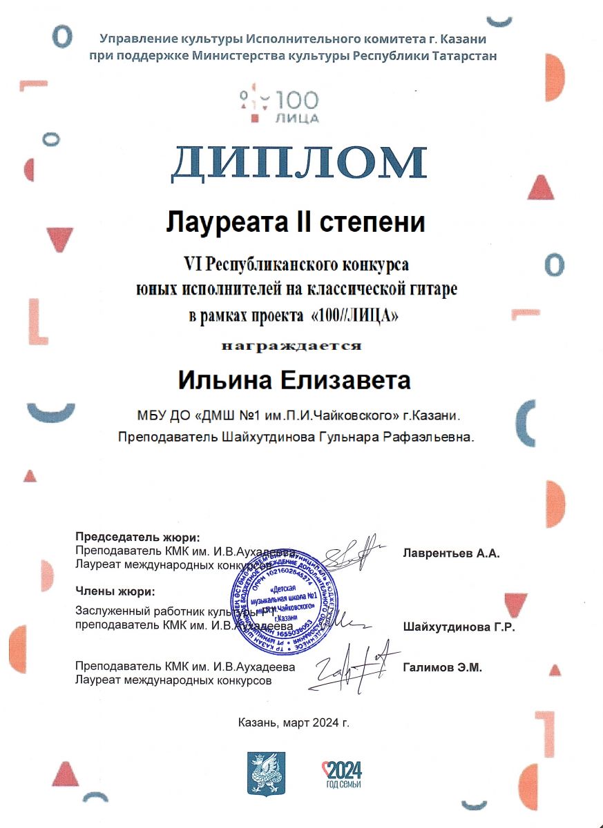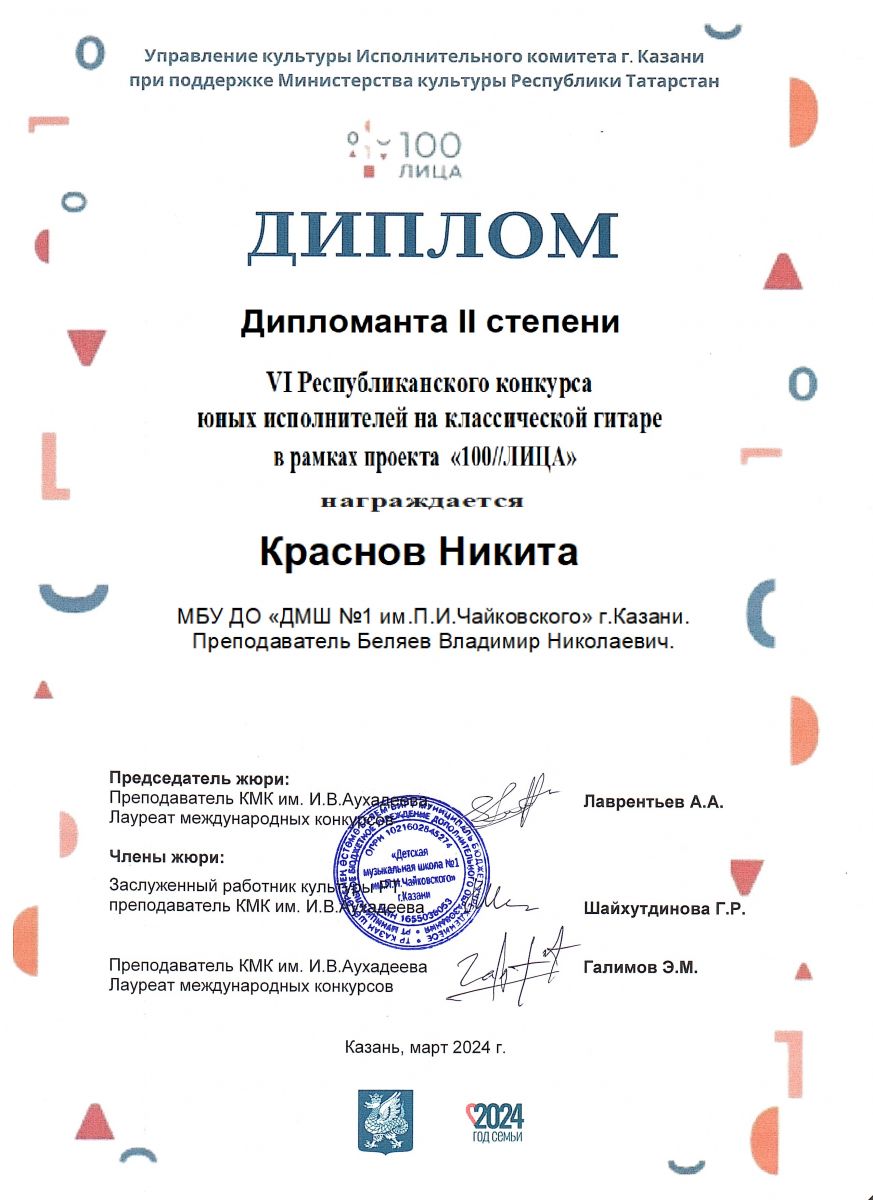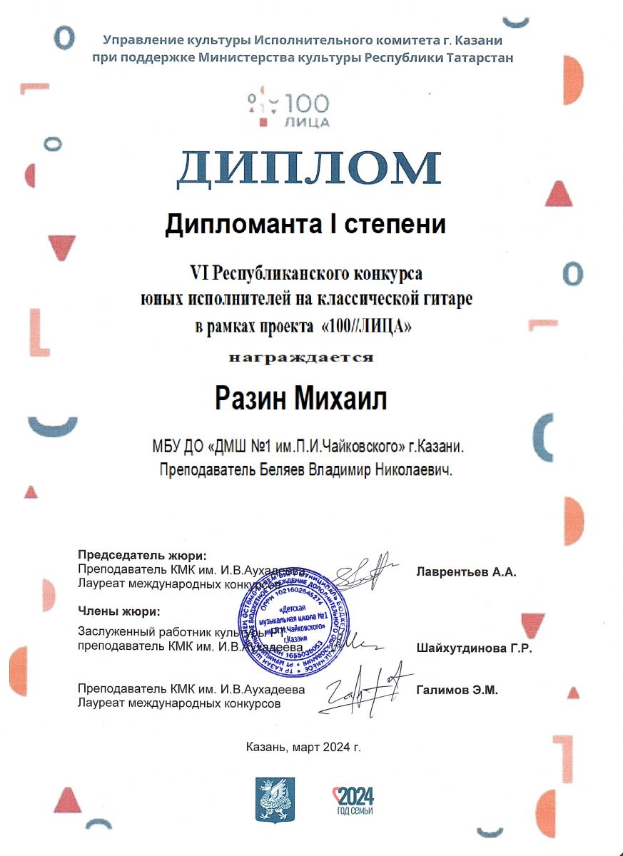 Республиканский конкурс виртуозной музыки скрипачей и виолончелистов "Presto" в рамках проекта 100//ЛИЦА - Лауреат степени, класс Сытиковой Н.А., концертмейстер Мирханов Ф.М.;