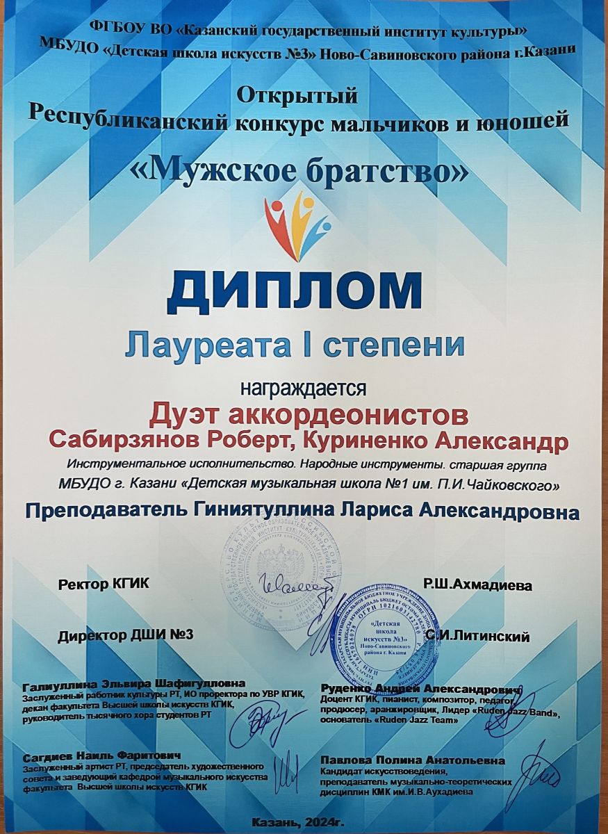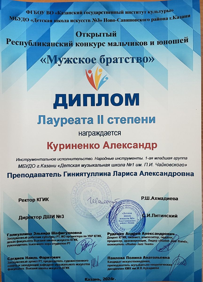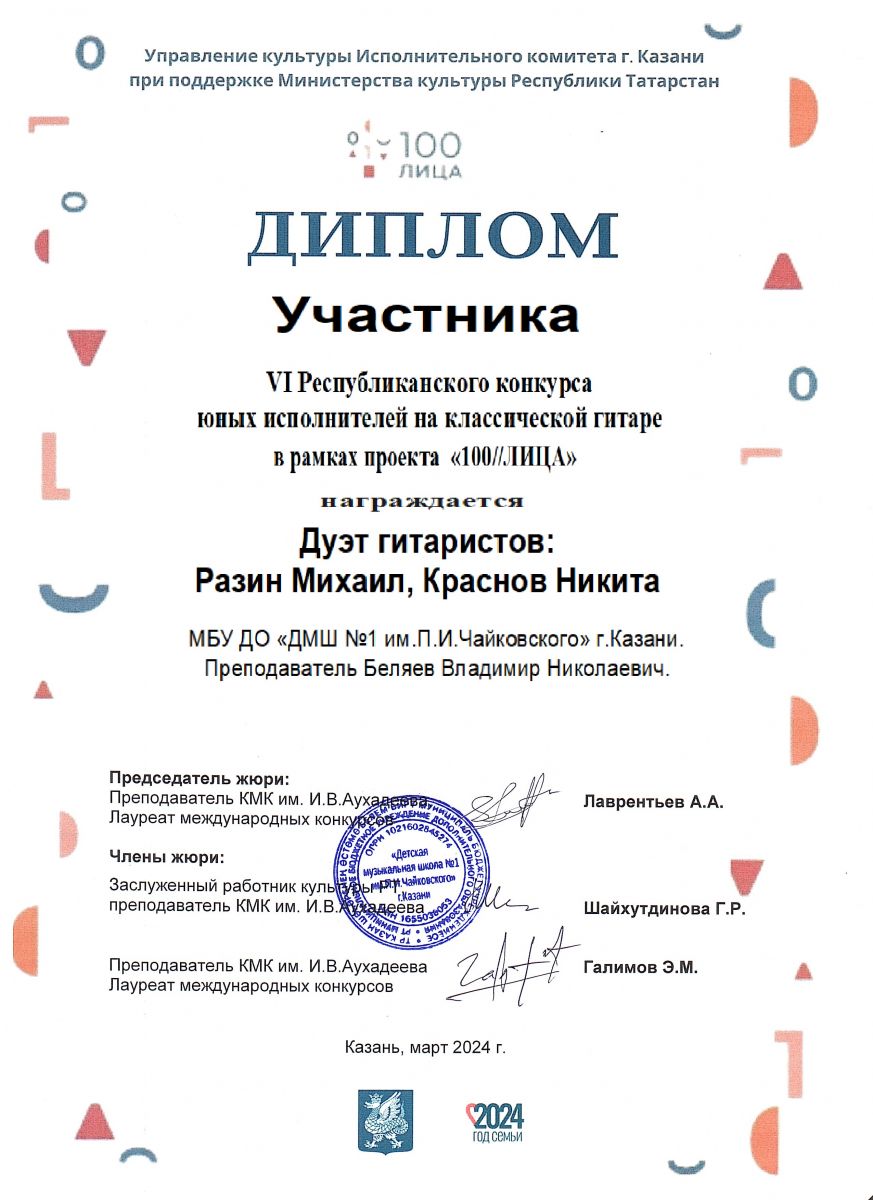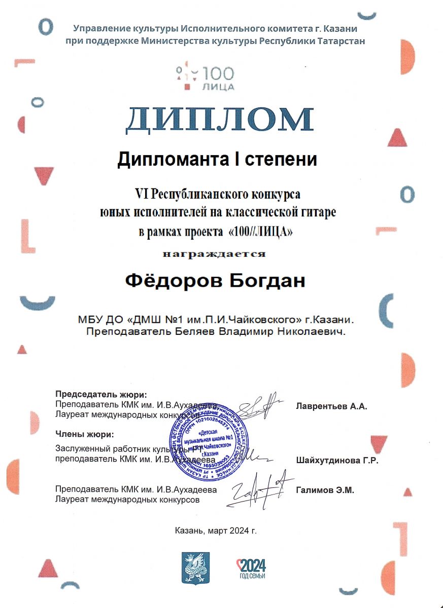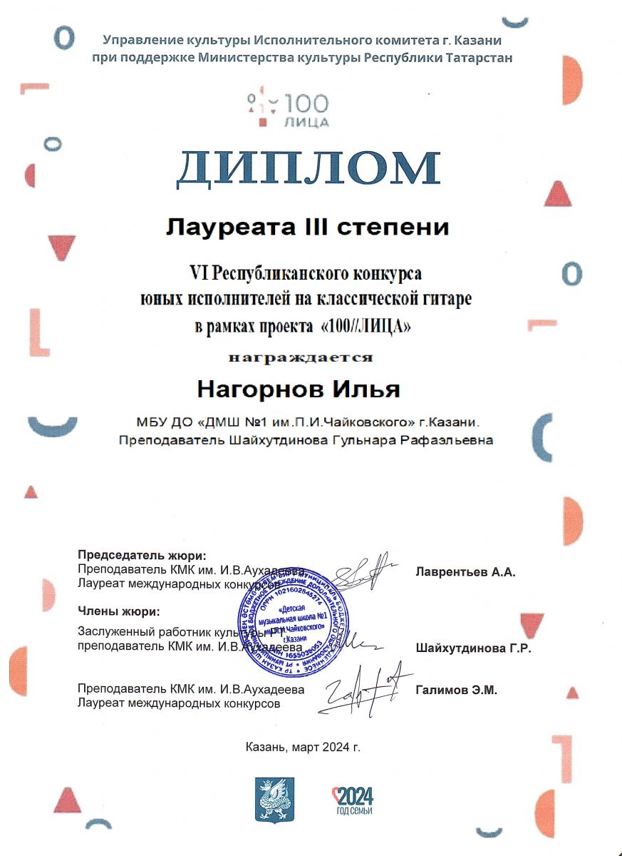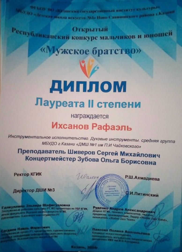 Республиканский конкурс виртуозной музыки скрипачей и виолончелистов "Presto" в рамках проекта 100//ЛИЦА - Лауреат степени, класс Сытиковой Н.А., концертмейстер Мирханов Ф.М.;