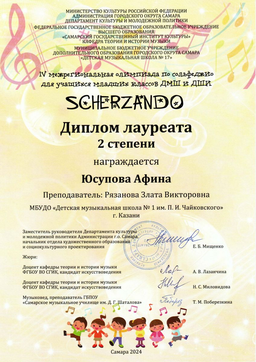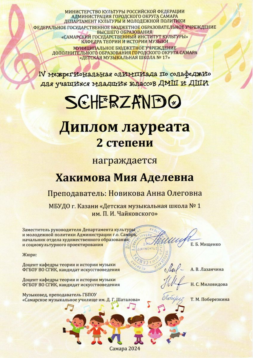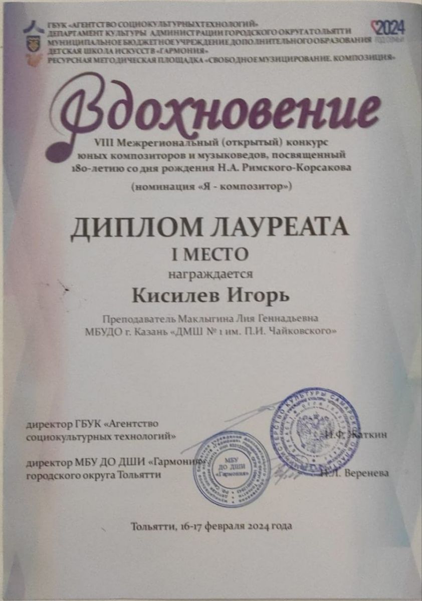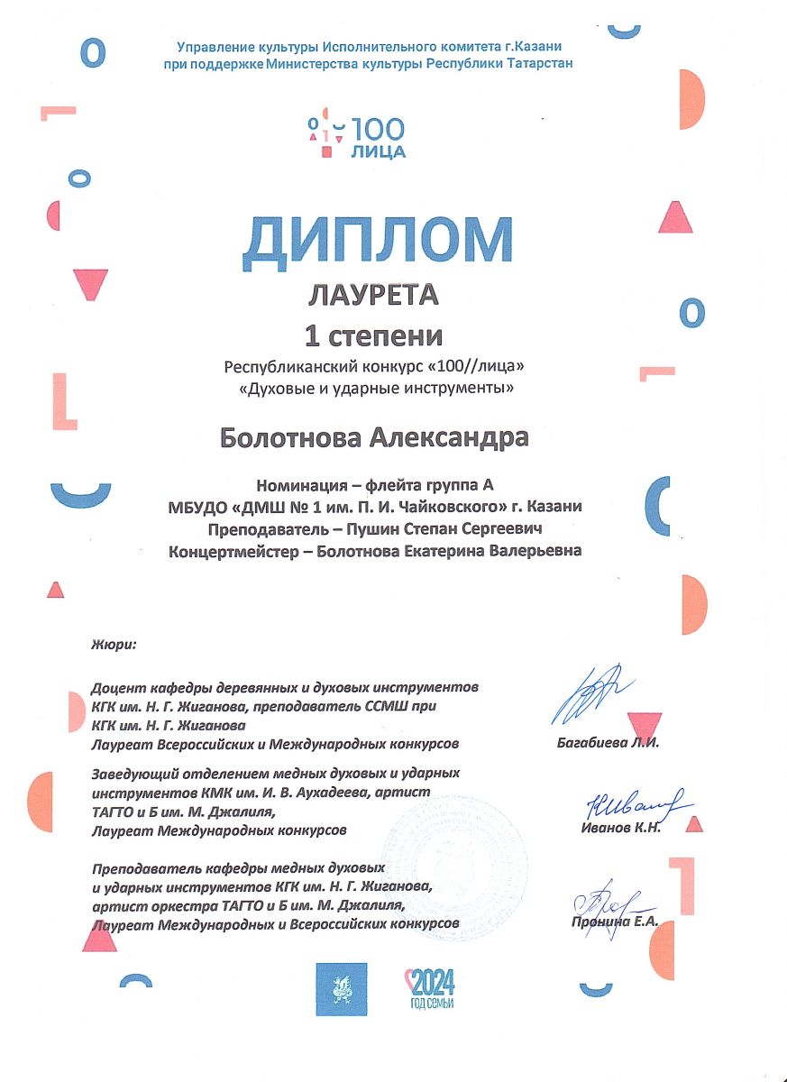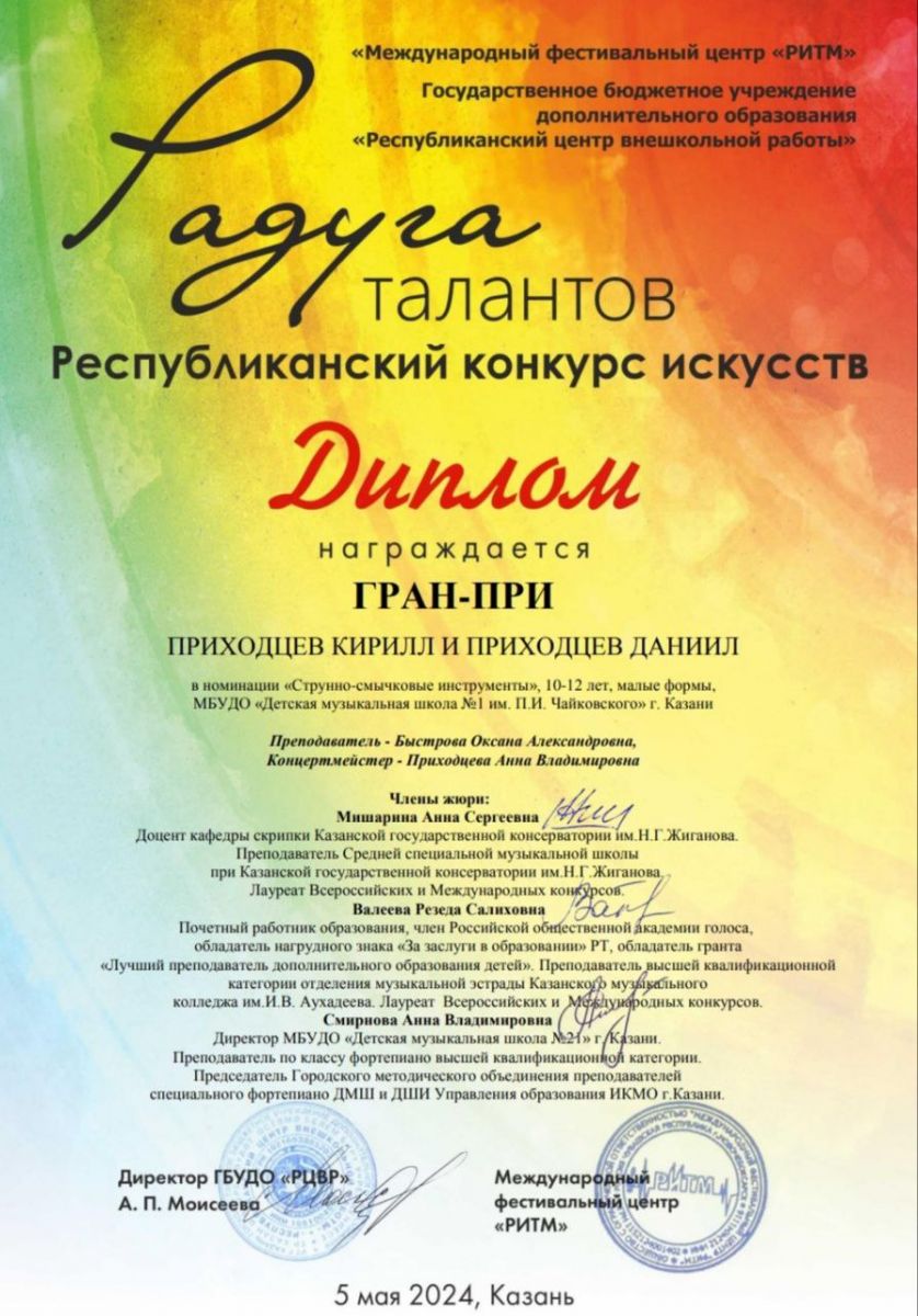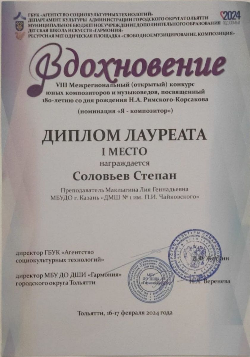 Республиканский конкурс виртуозной музыки скрипачей и виолончелистов "Presto" в рамках проекта 100//ЛИЦА - Лауреат степени, класс Сытиковой Н.А., концертмейстер Мирханов Ф.М.;