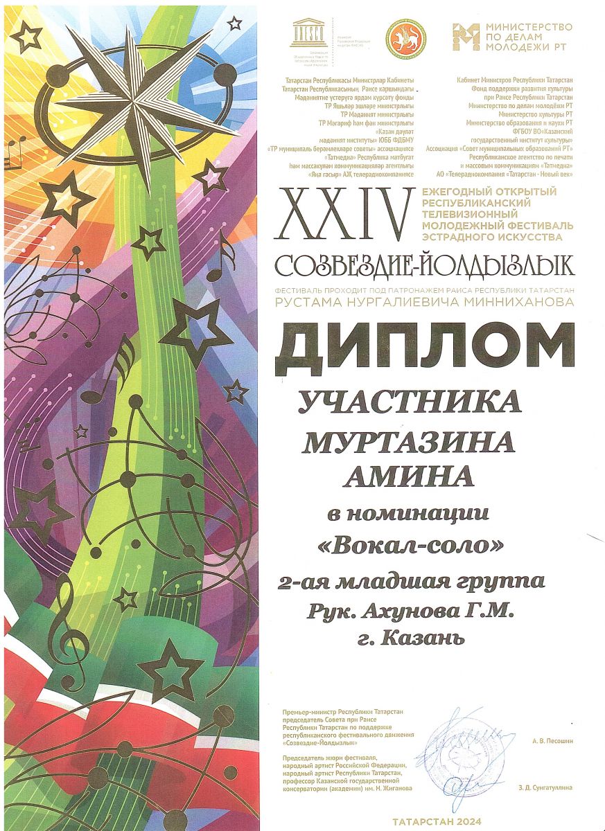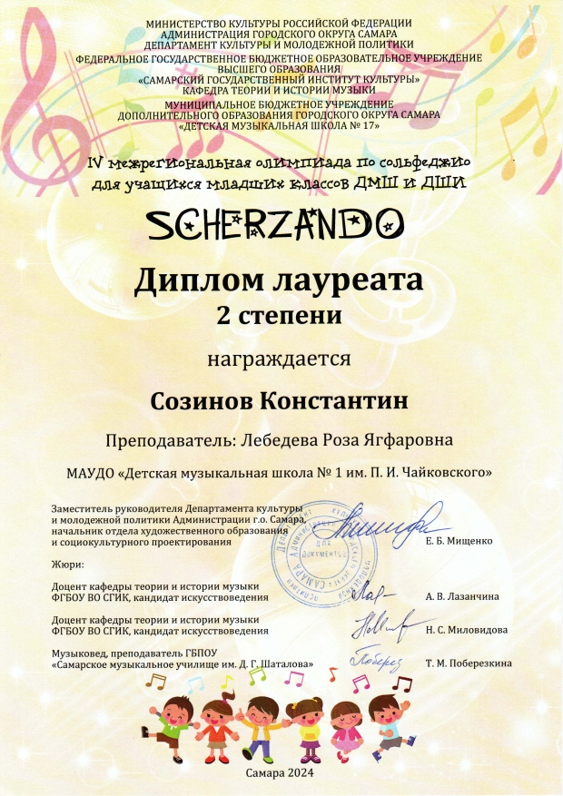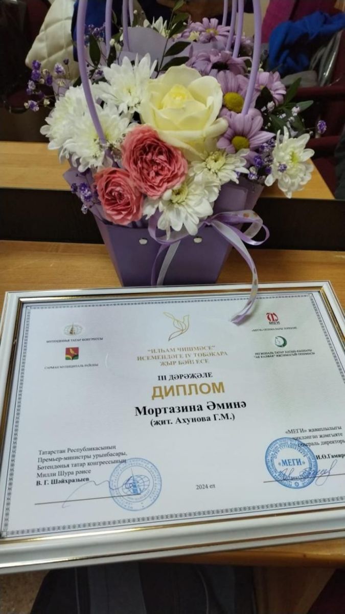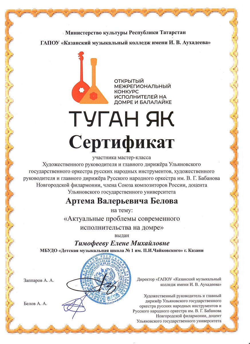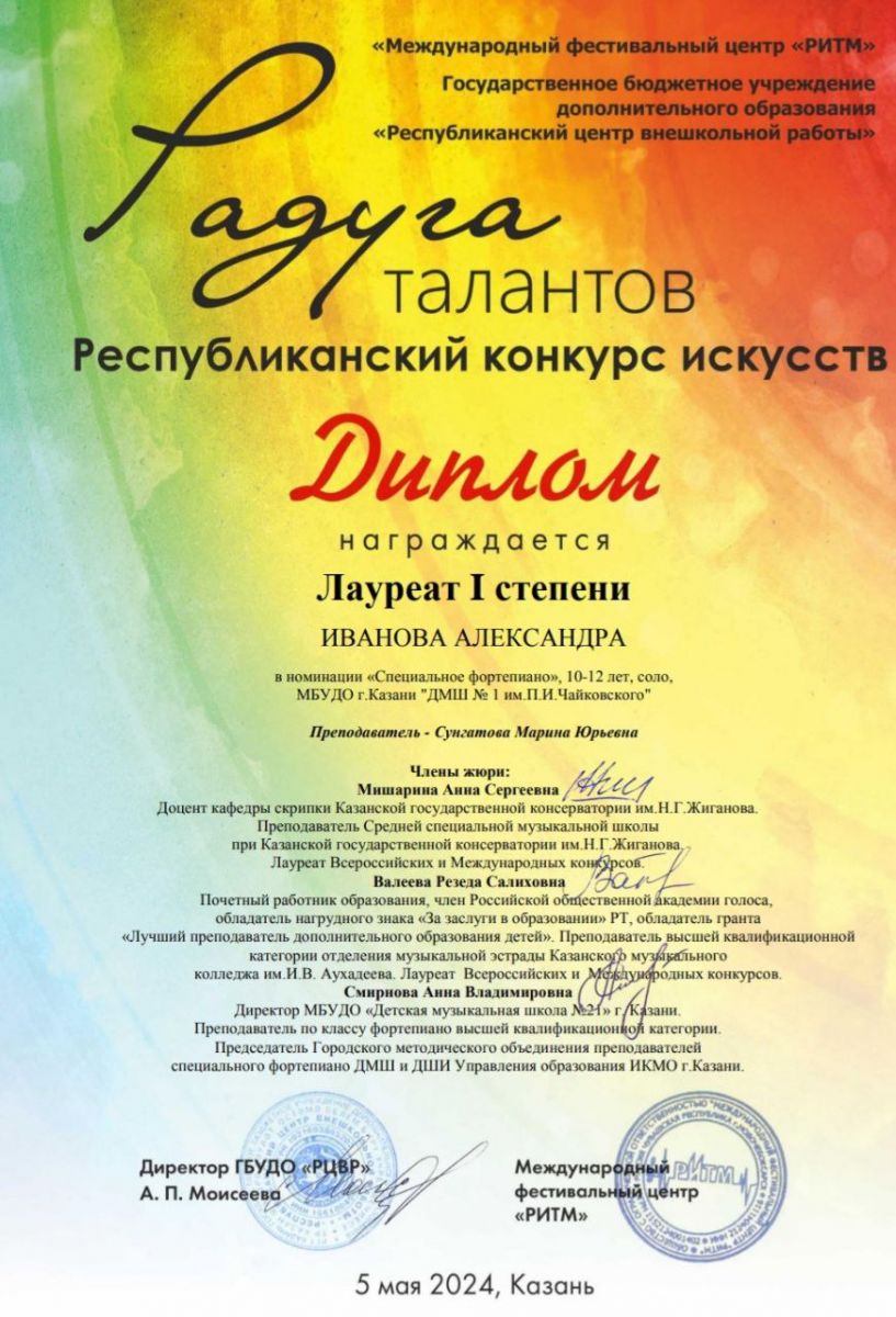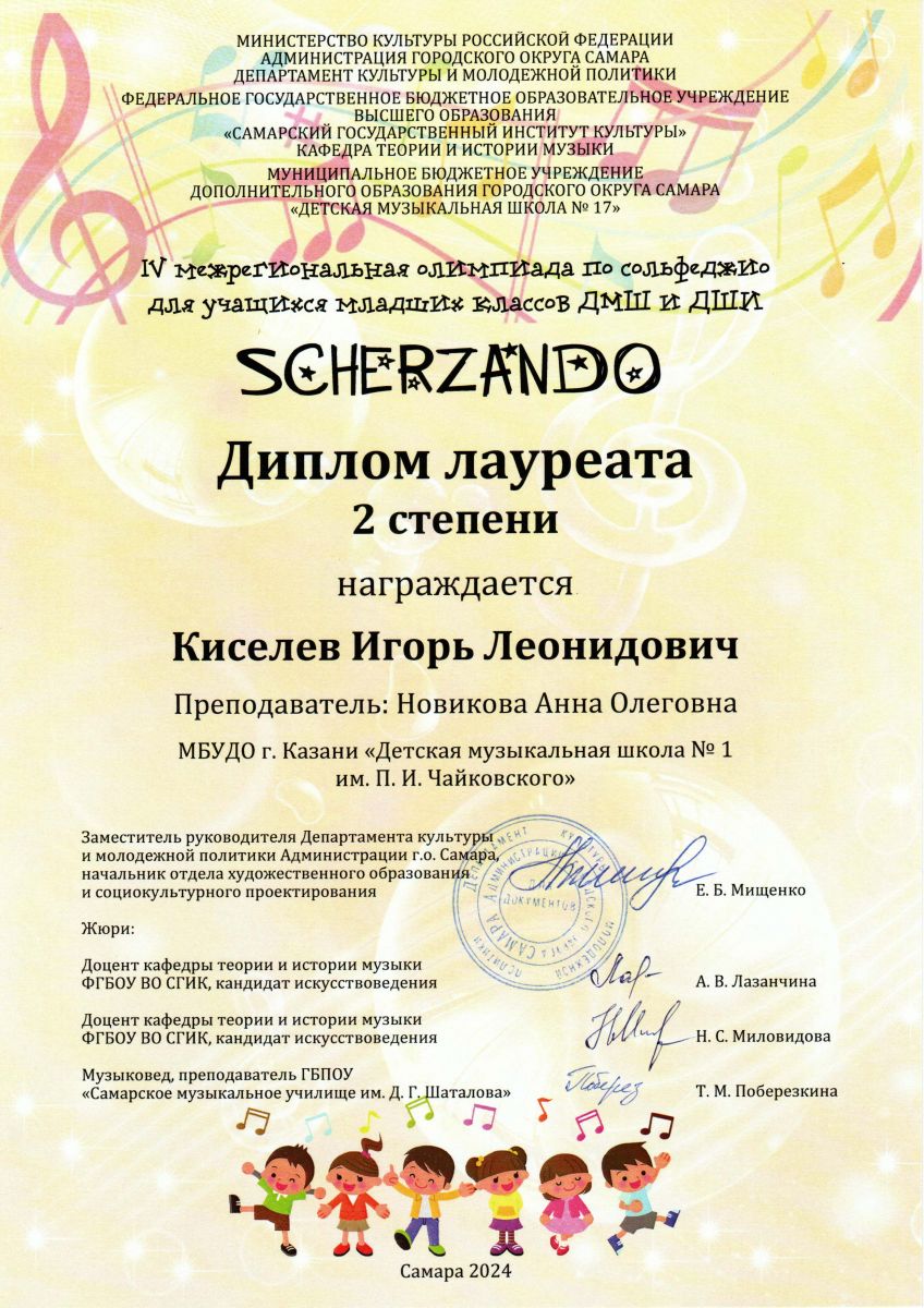 Республиканский конкурс виртуозной музыки скрипачей и виолончелистов "Presto" в рамках проекта 100//ЛИЦА - Лауреат степени, класс Сытиковой Н.А., концертмейстер Мирханов Ф.М.;