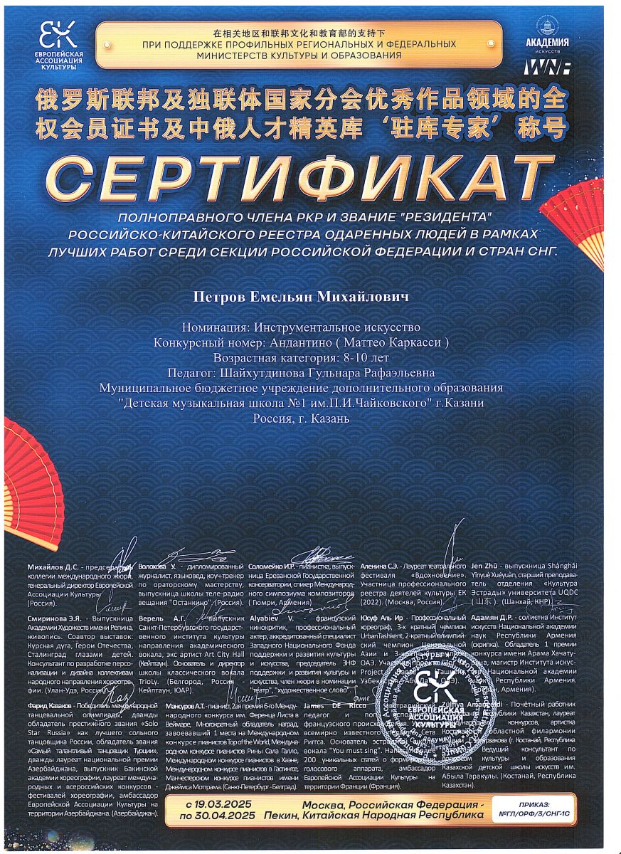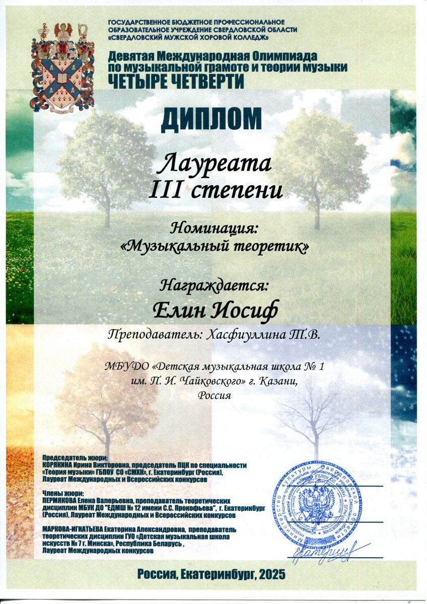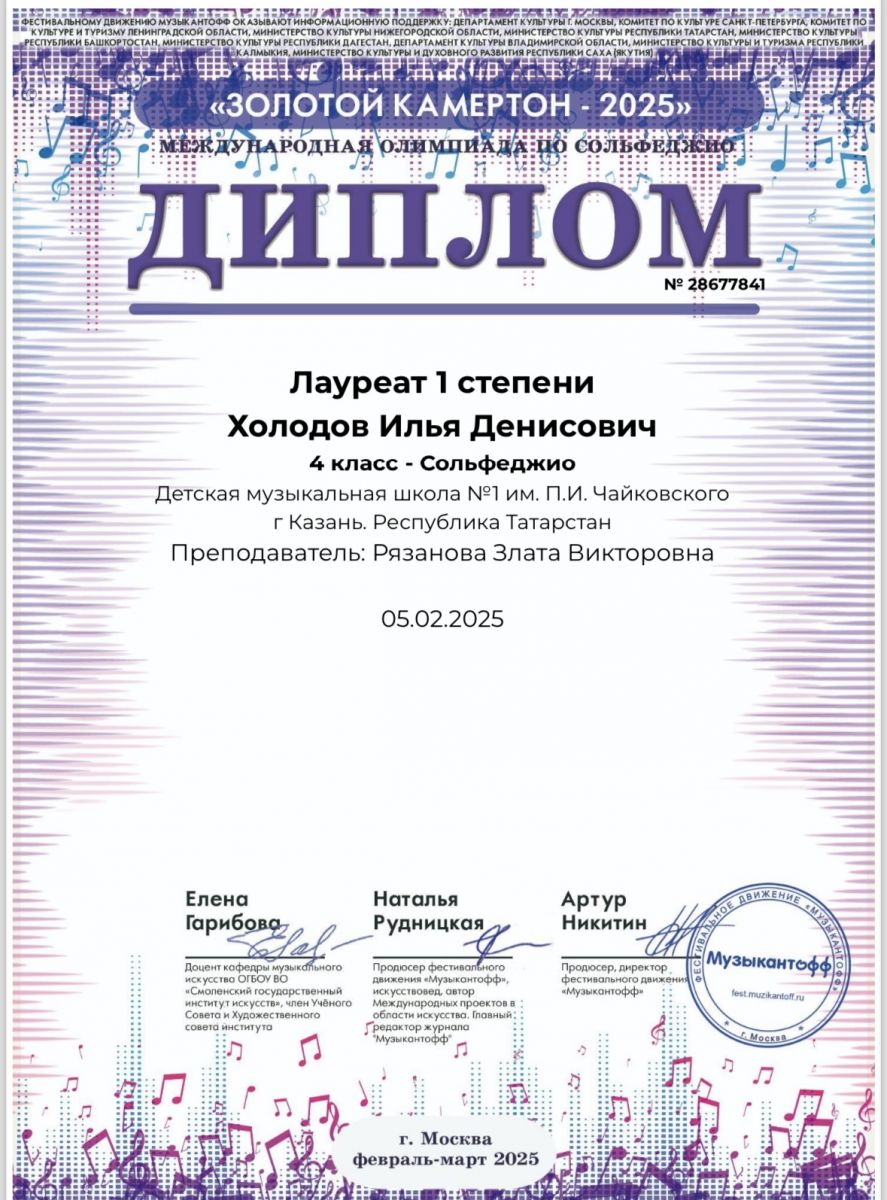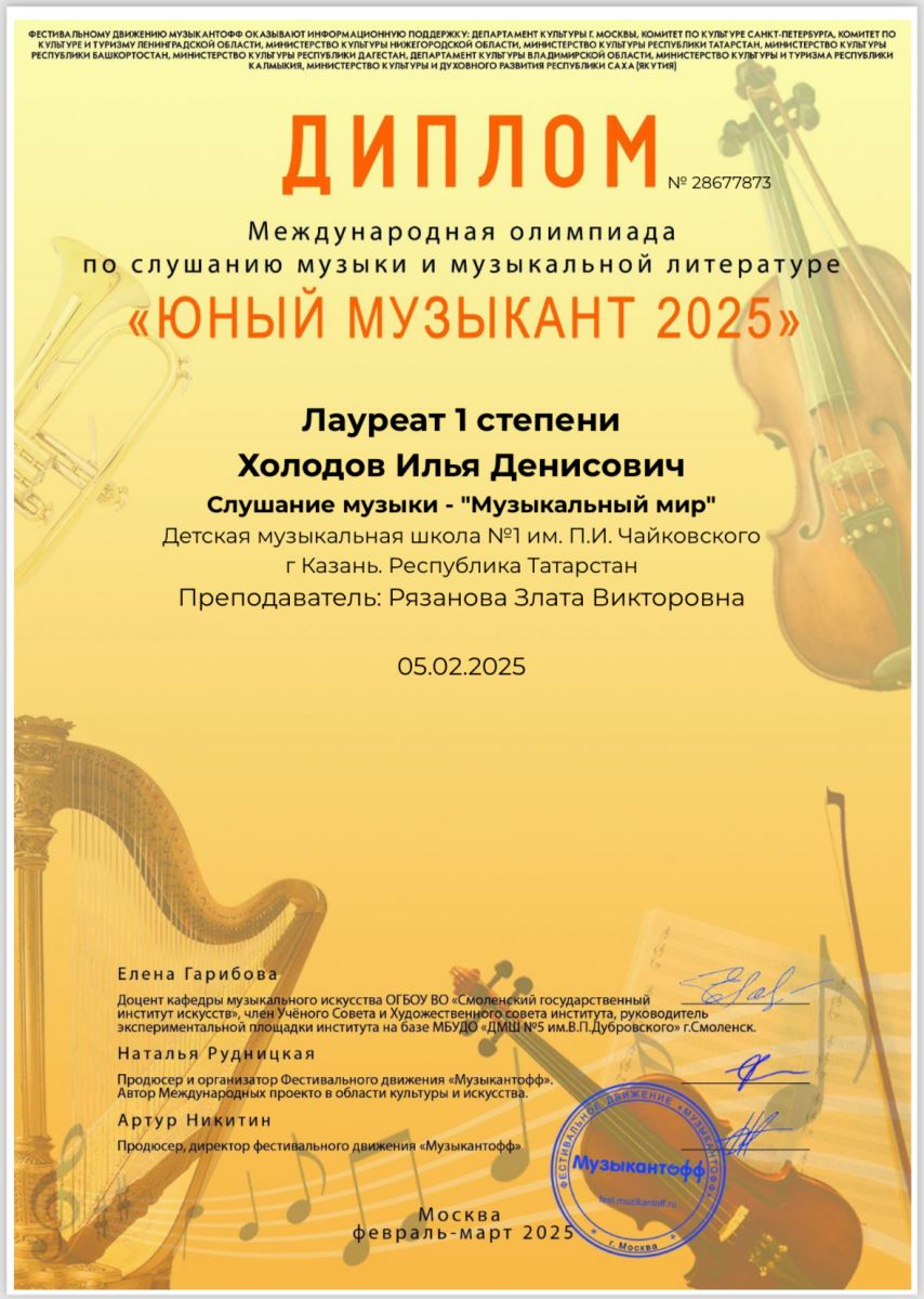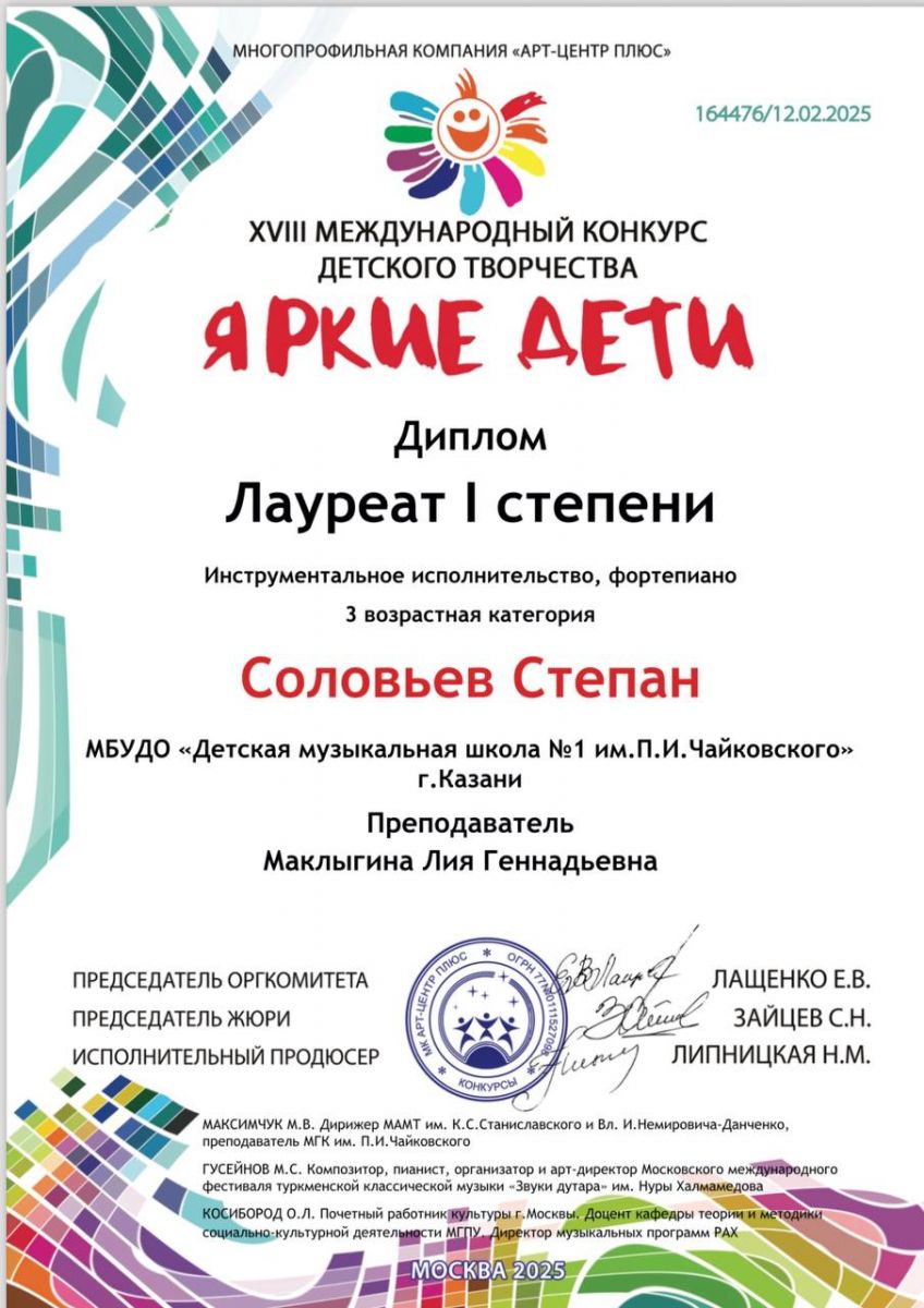 IV Международная олимпиада по сольфеджио среди обучающихся ДМШ и ДШИ "Кантилена" - Петров Емельян, Лауреат I степени, класс Хасфиуллиной Т.В.;