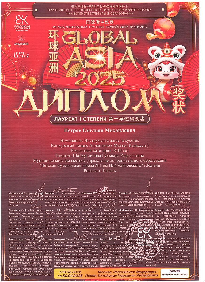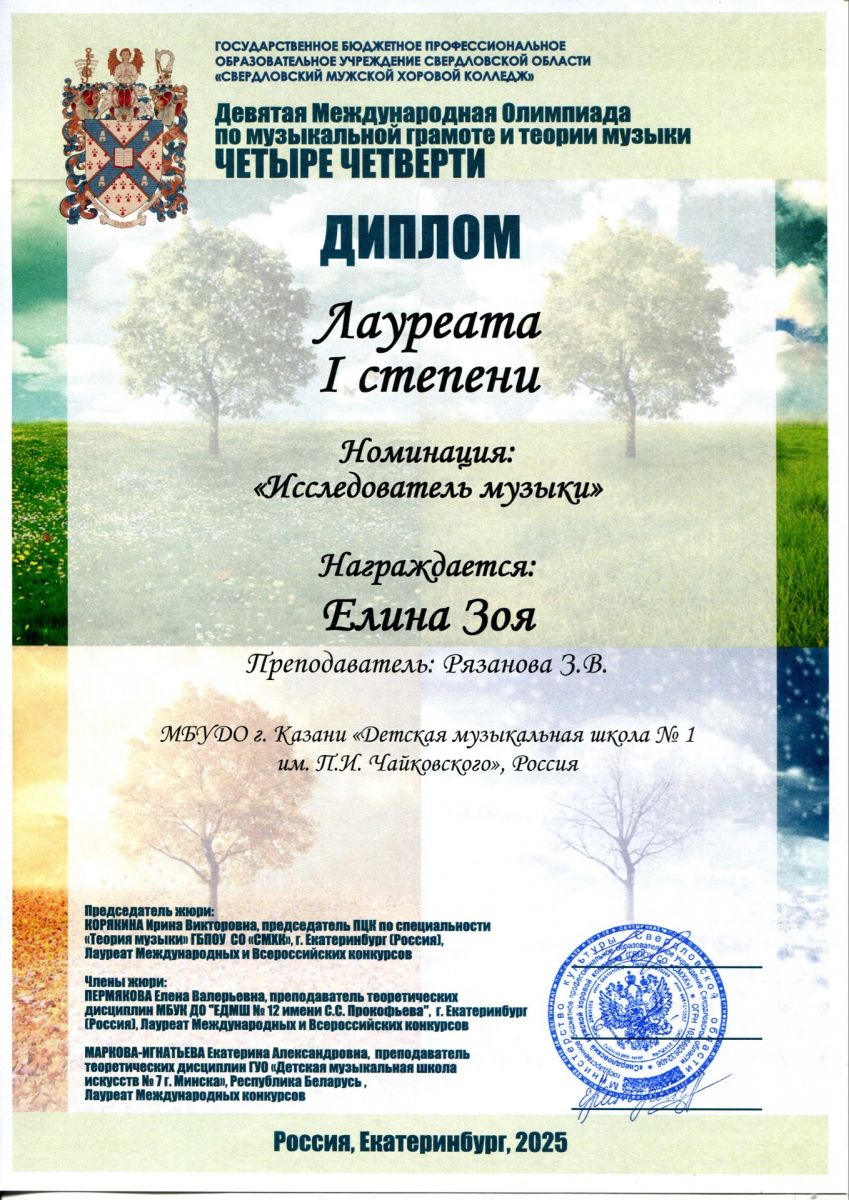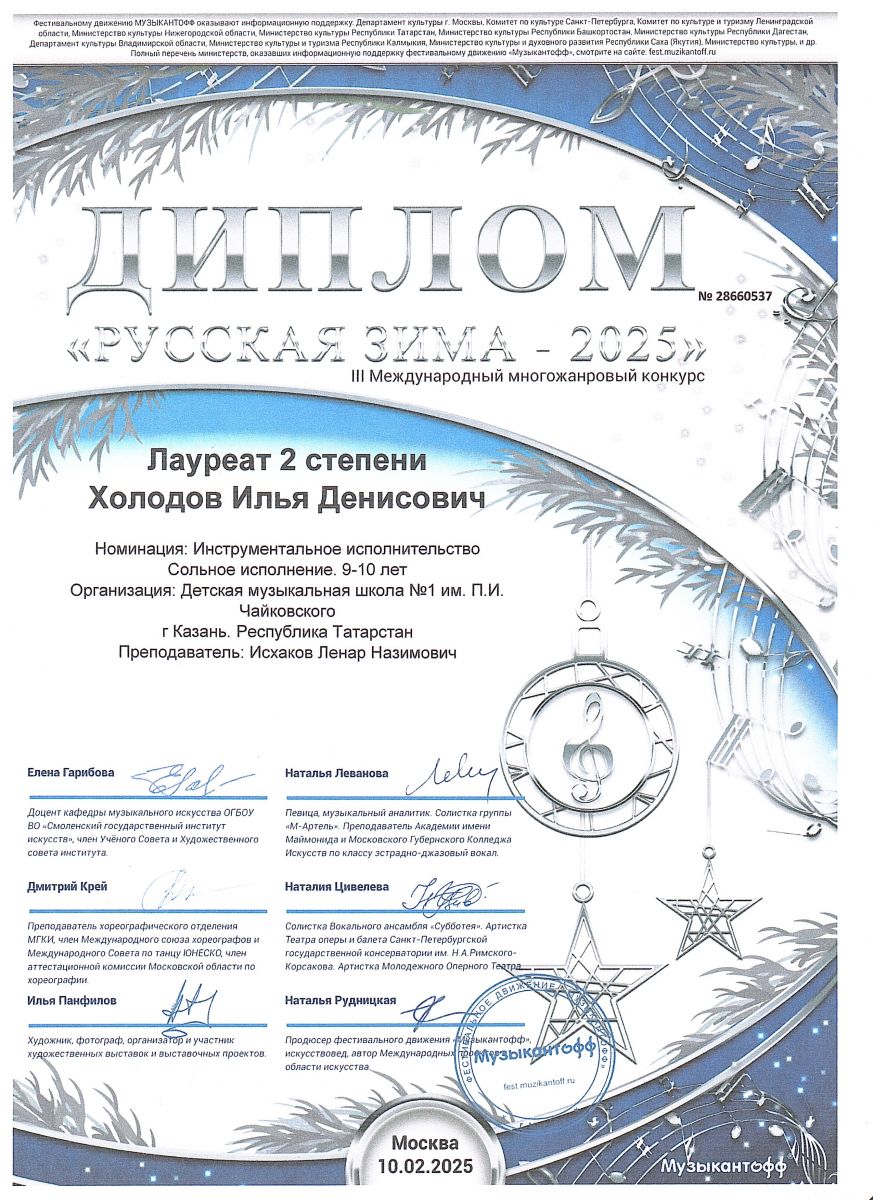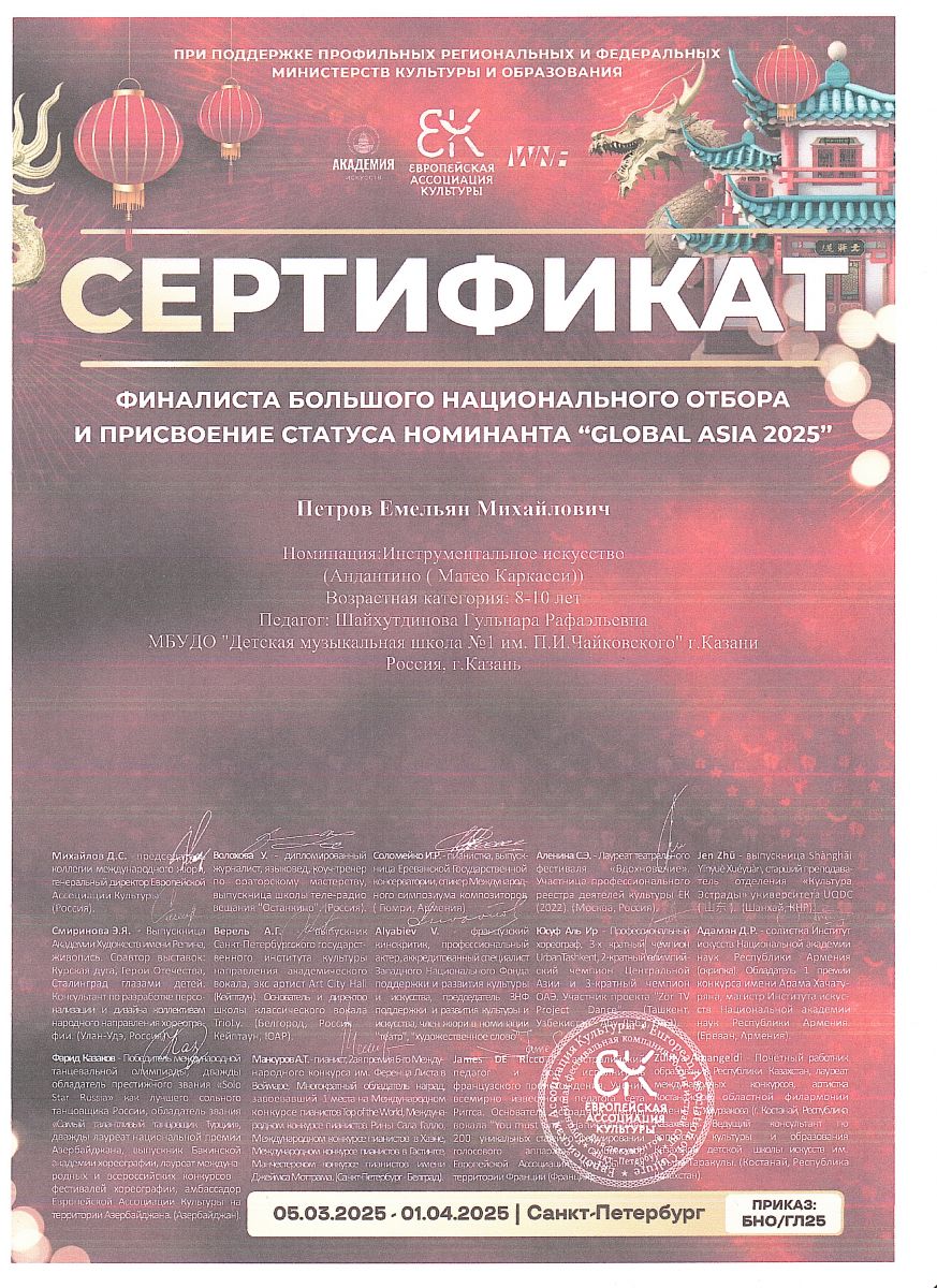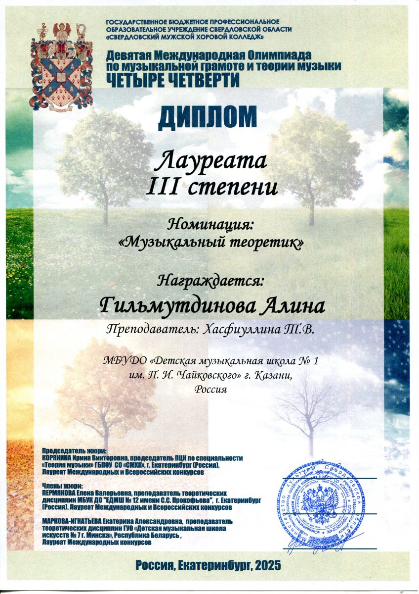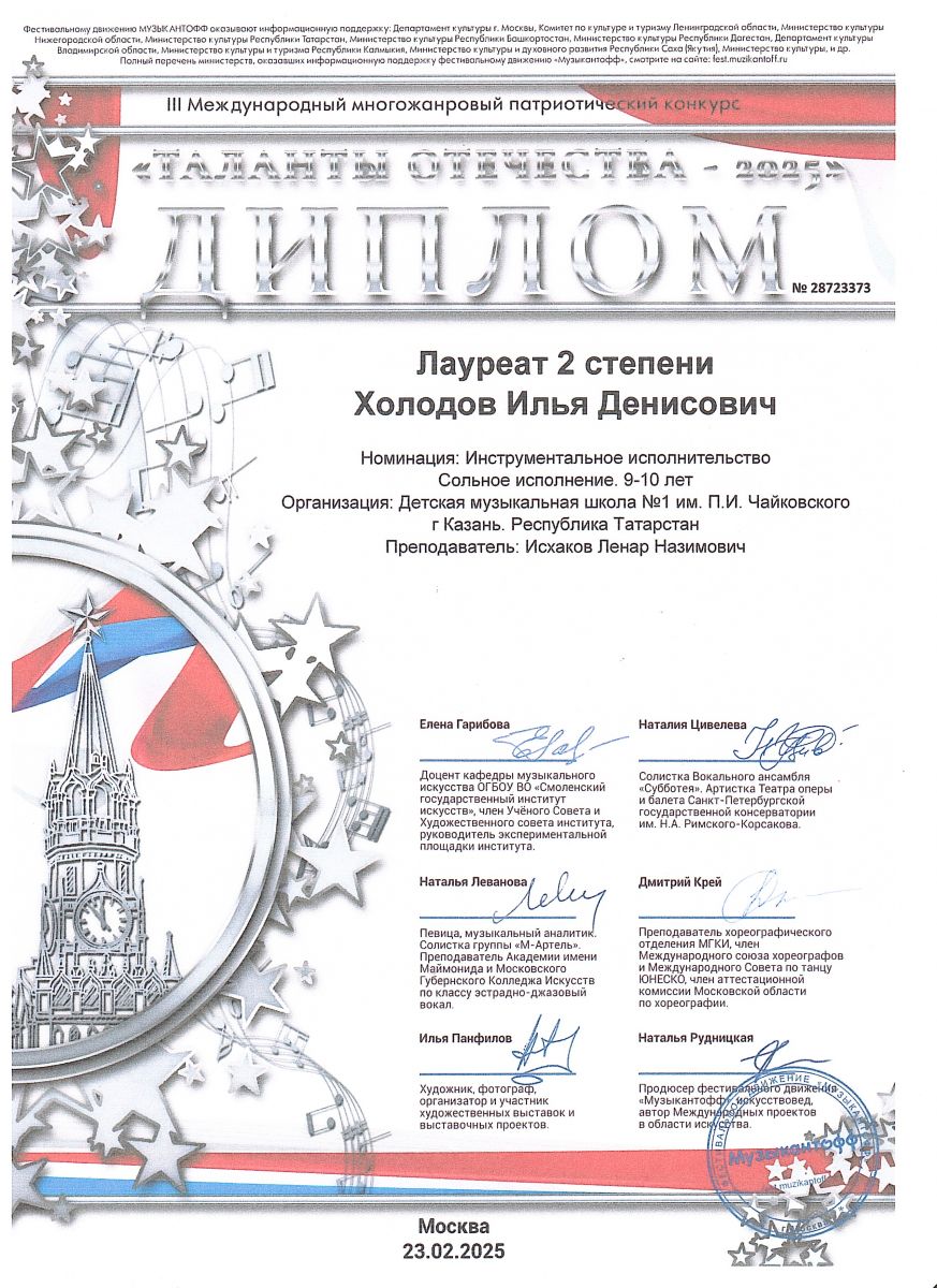 IV Международная олимпиада по сольфеджио среди обучающихся ДМШ и ДШИ "Кантилена" - Петров Емельян, Лауреат I степени, класс Хасфиуллиной Т.В.;