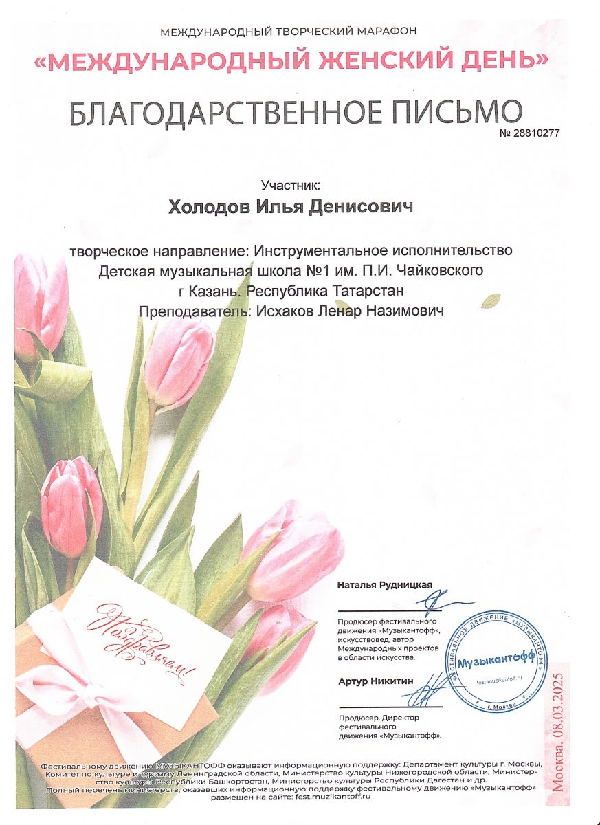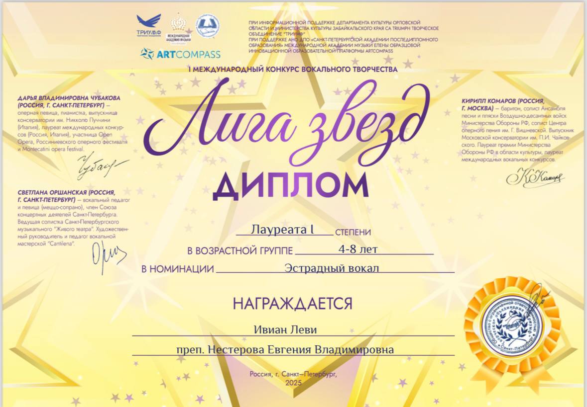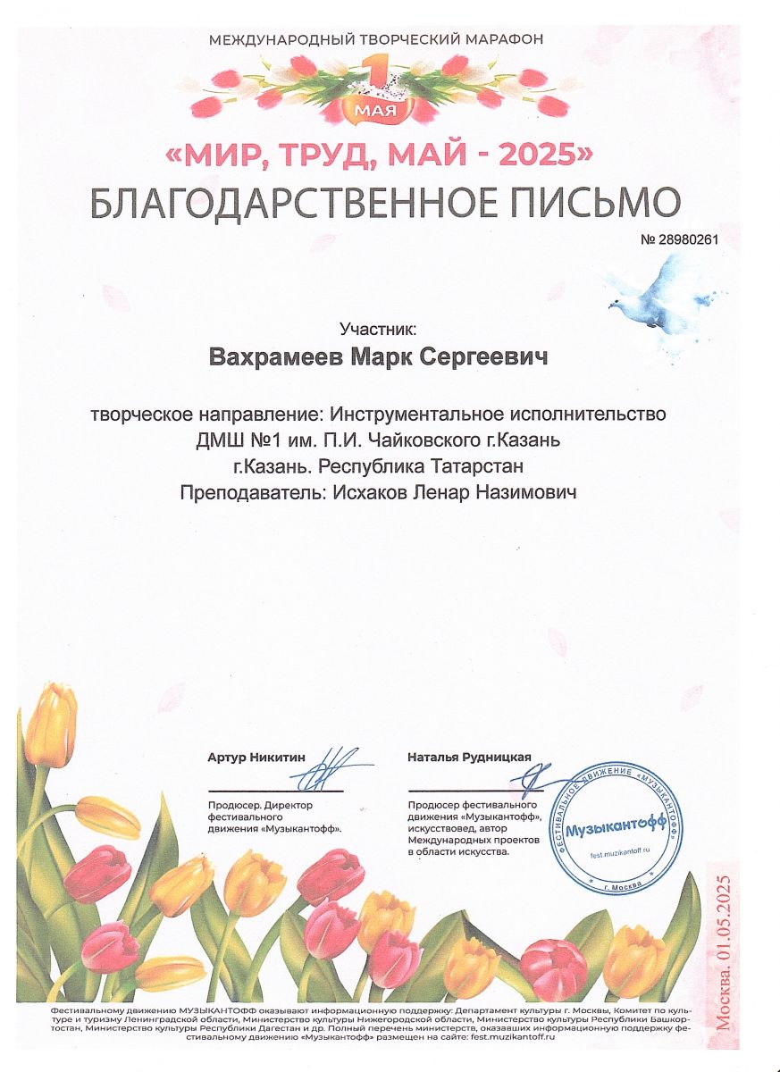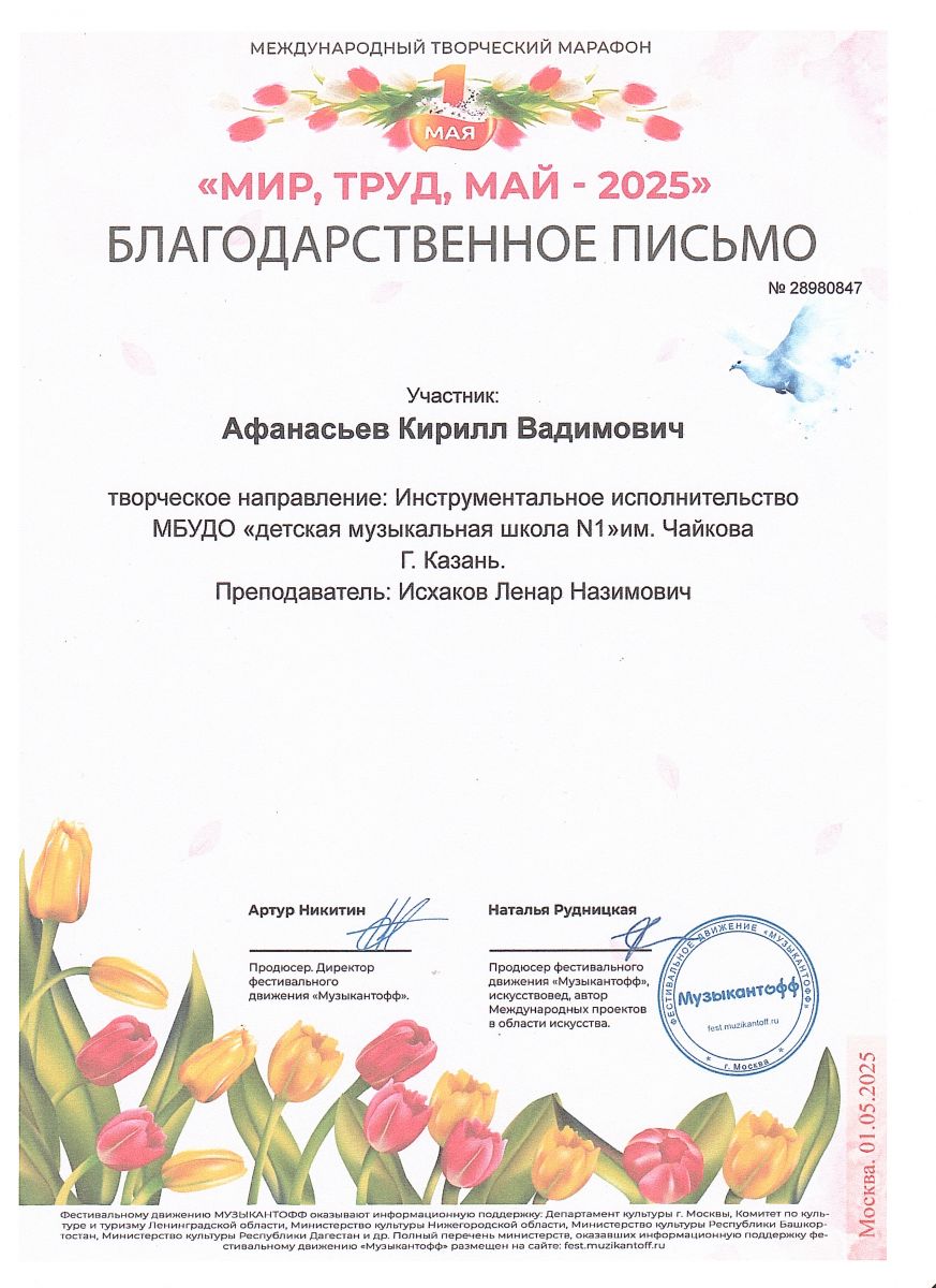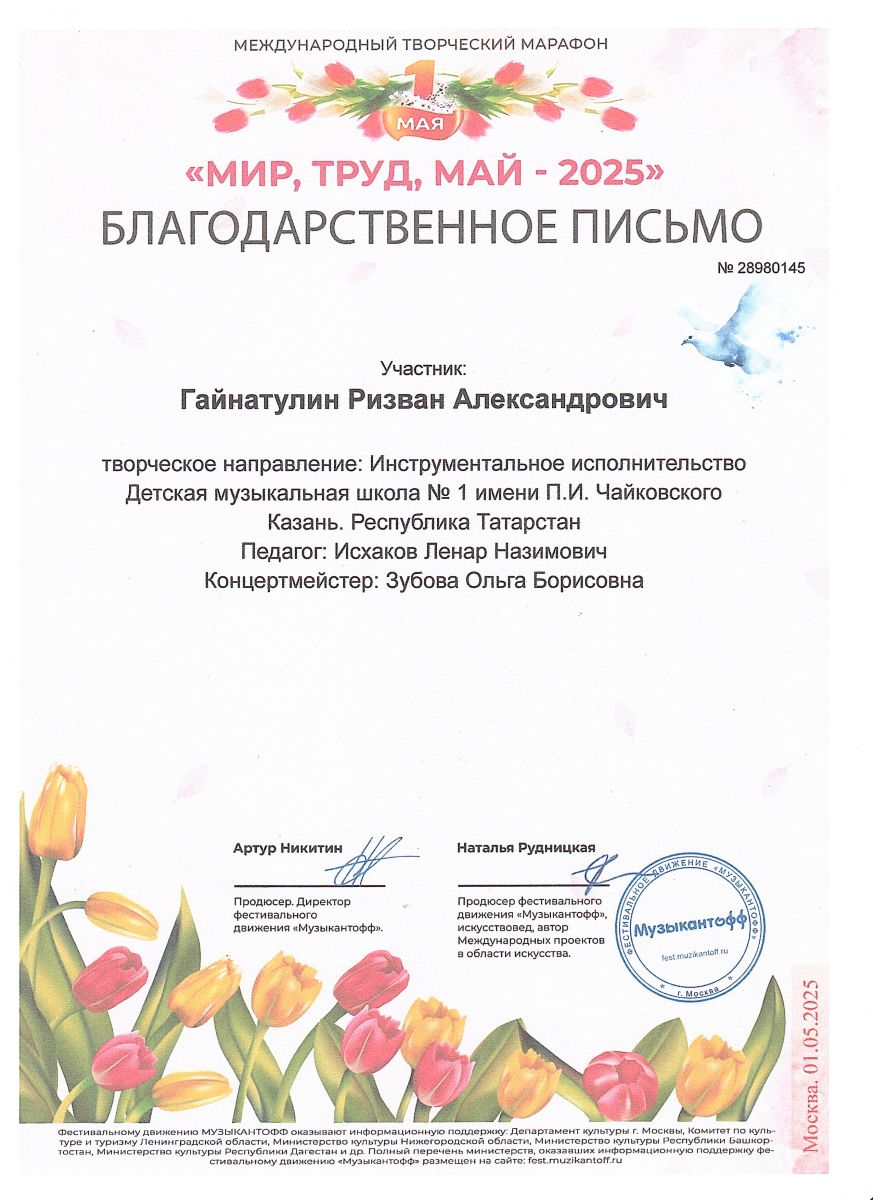 IV Международная олимпиада по сольфеджио среди обучающихся ДМШ и ДШИ "Кантилена" - Петров Емельян, Лауреат I степени, класс Хасфиуллиной Т.В.;
