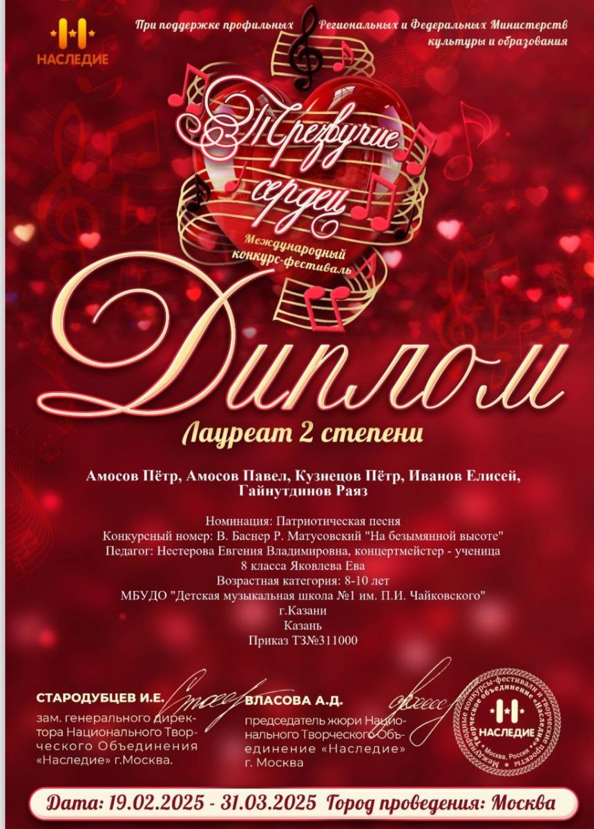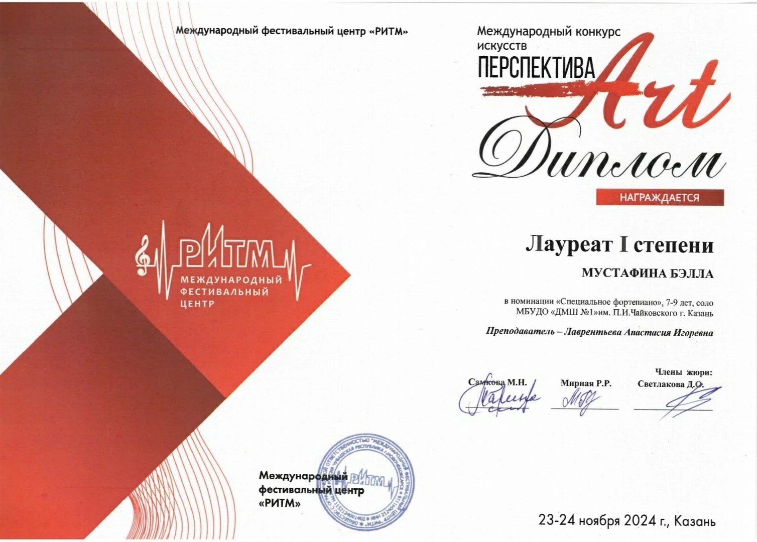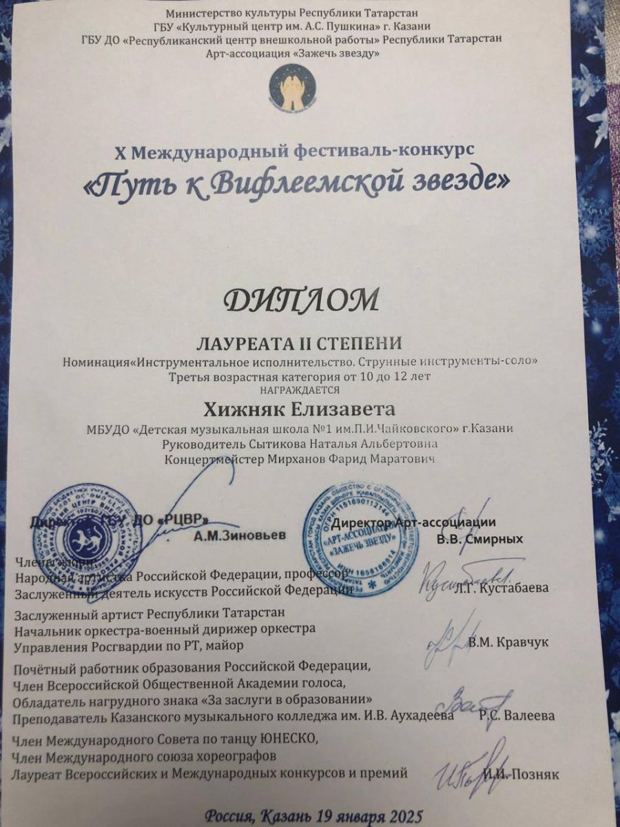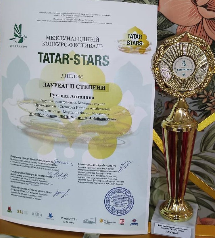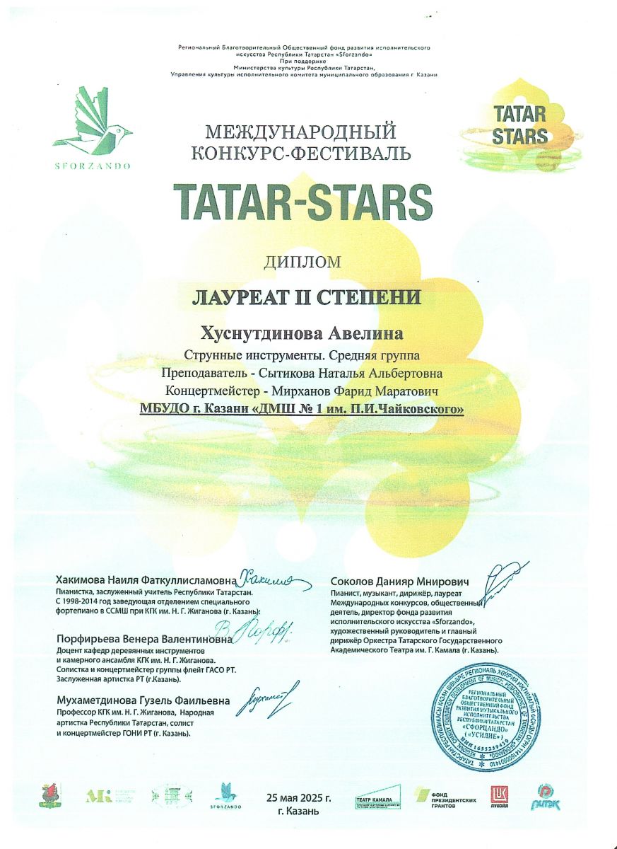 Международный конкурс-фестиваль "TATAR-STARS" - Хуснутдинова Авелина, Лауреат II степени, класс Сытиковой Н.А., концертмейстер Мирханов Ф.М.;