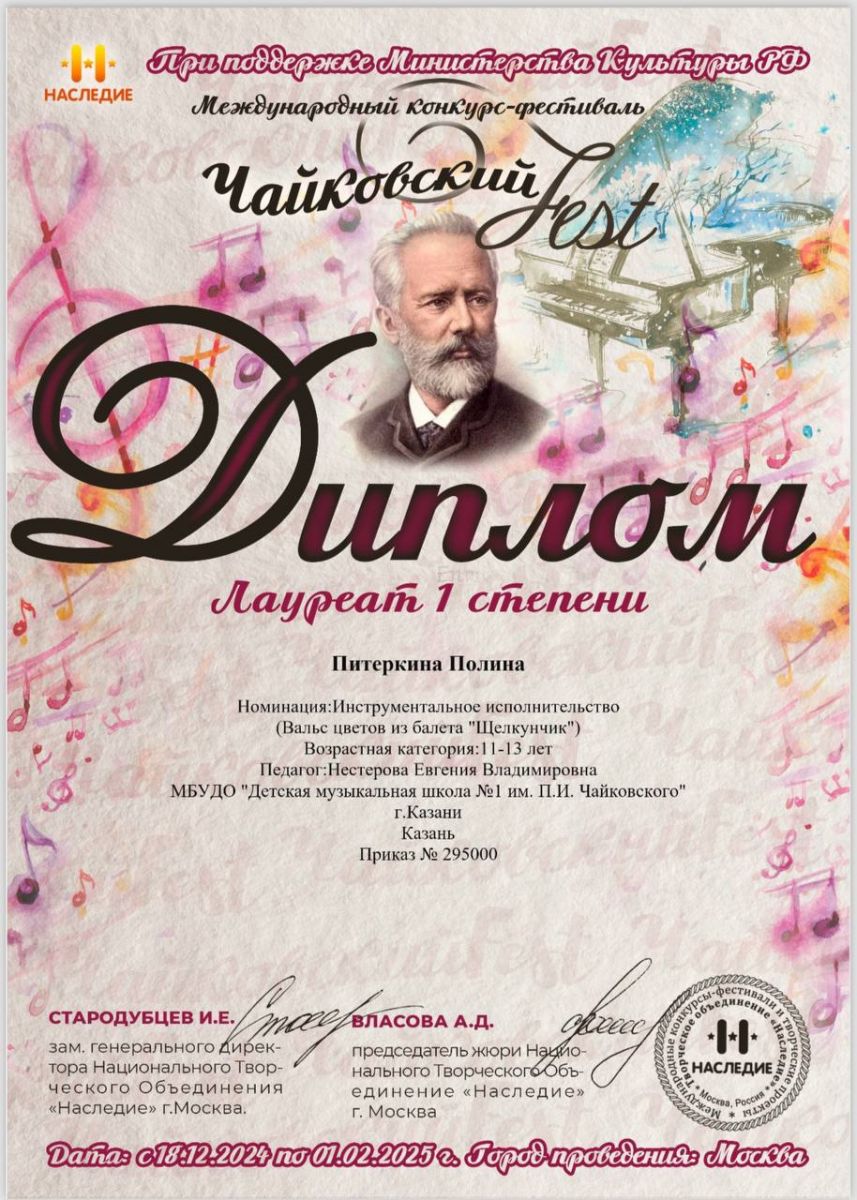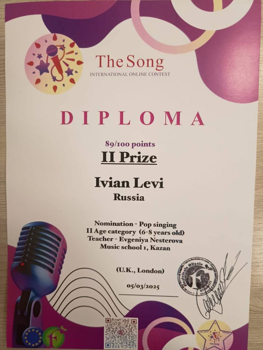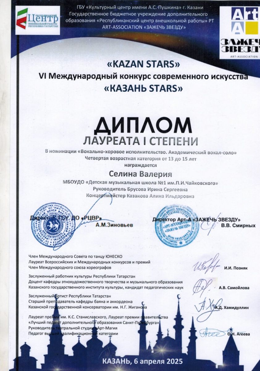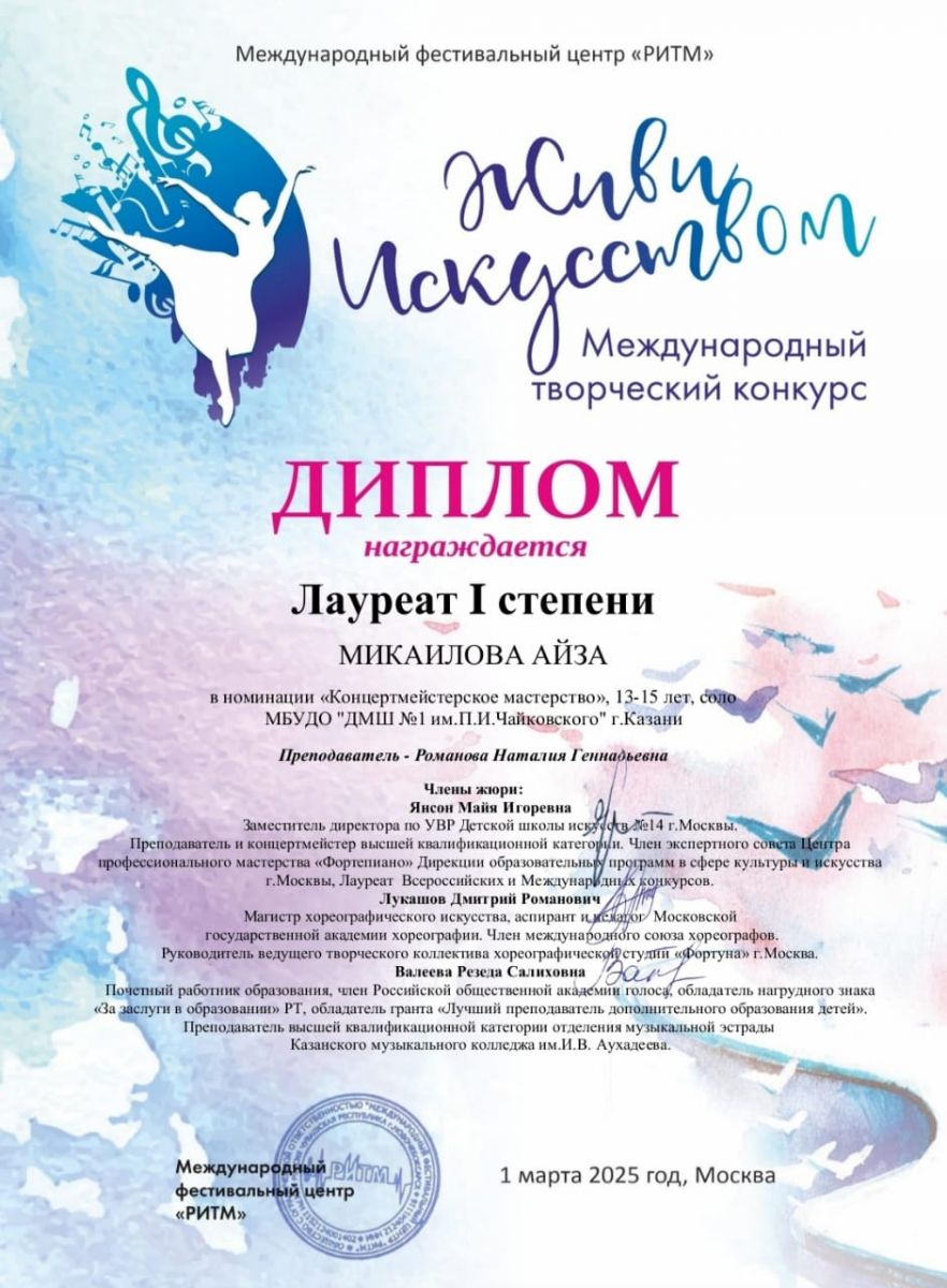 Международный конкурс-фестиваль "TATAR-STARS" - Хуснутдинова Авелина, Лауреат II степени, класс Сытиковой Н.А., концертмейстер Мирханов Ф.М.;