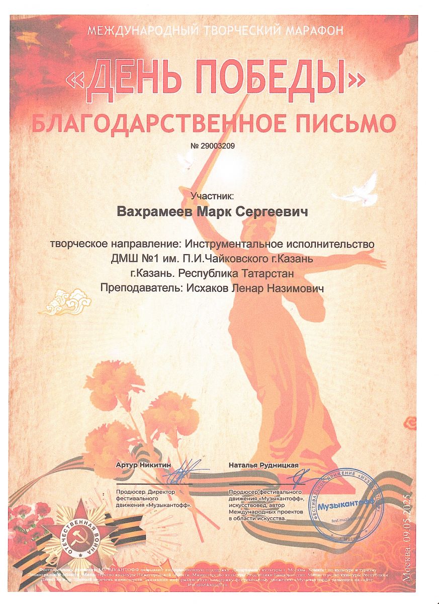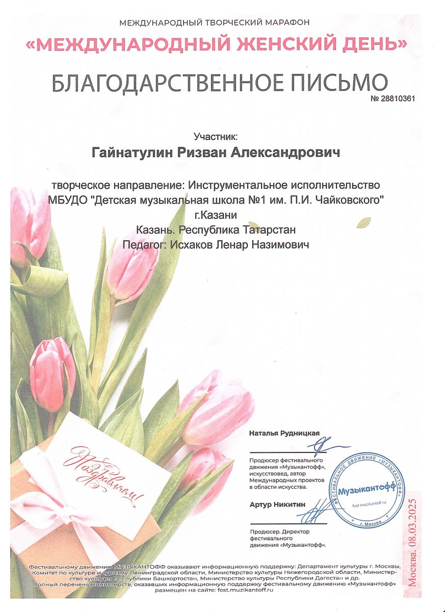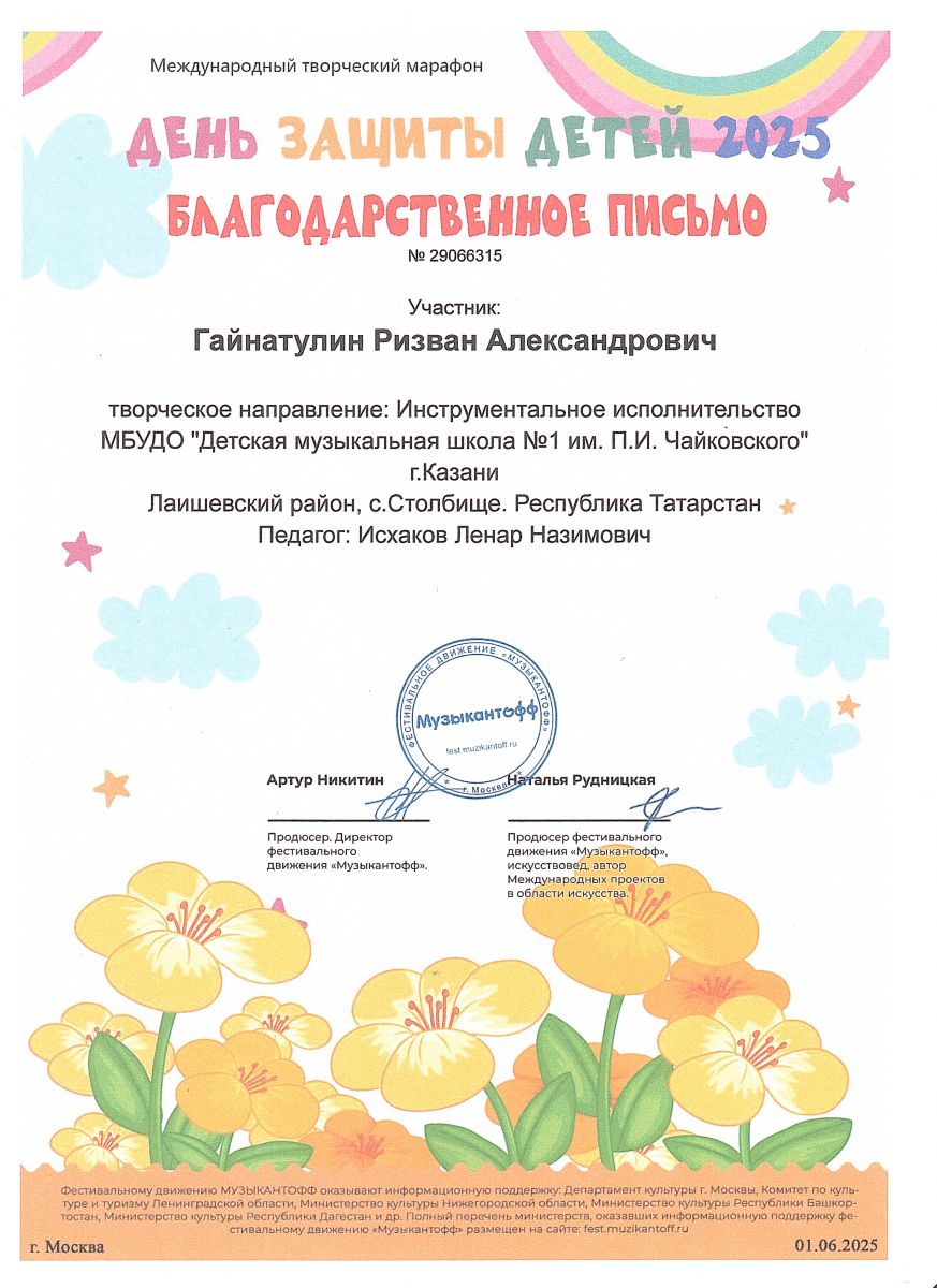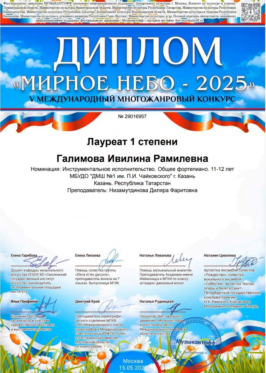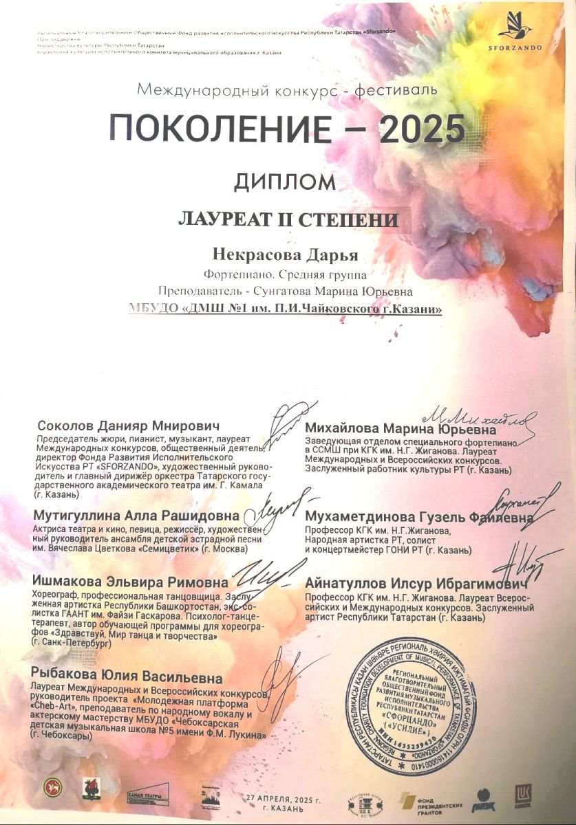 Международный конкурс-фестиваль "TATAR-STARS" - Хуснутдинова Авелина, Лауреат II степени, класс Сытиковой Н.А., концертмейстер Мирханов Ф.М.;