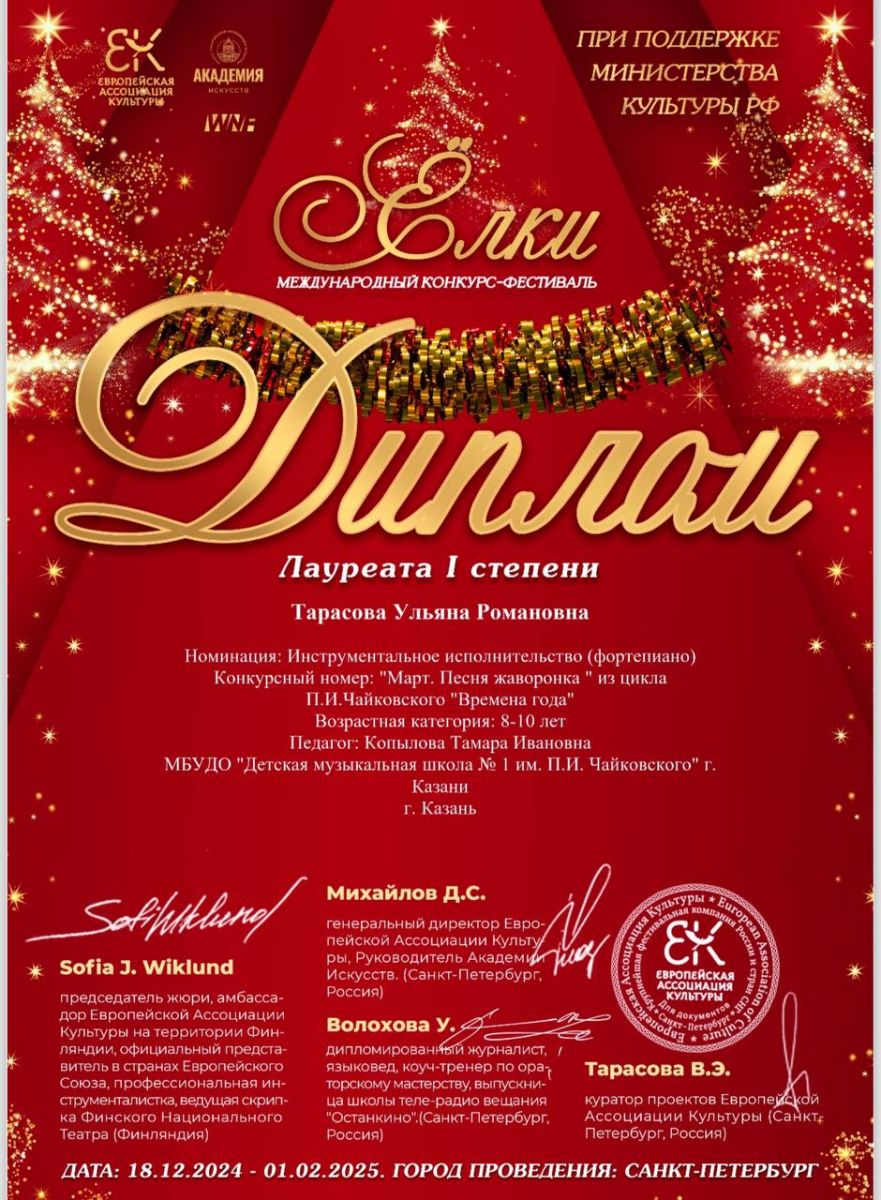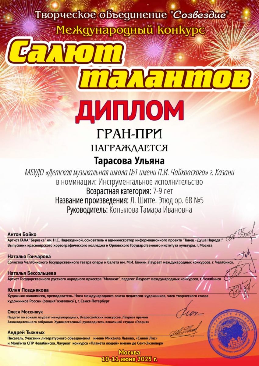 Международный конкурс  "Салют талантов" - Тарасова Ульяна, Гран-При, класс Кашаповой Г.М.;