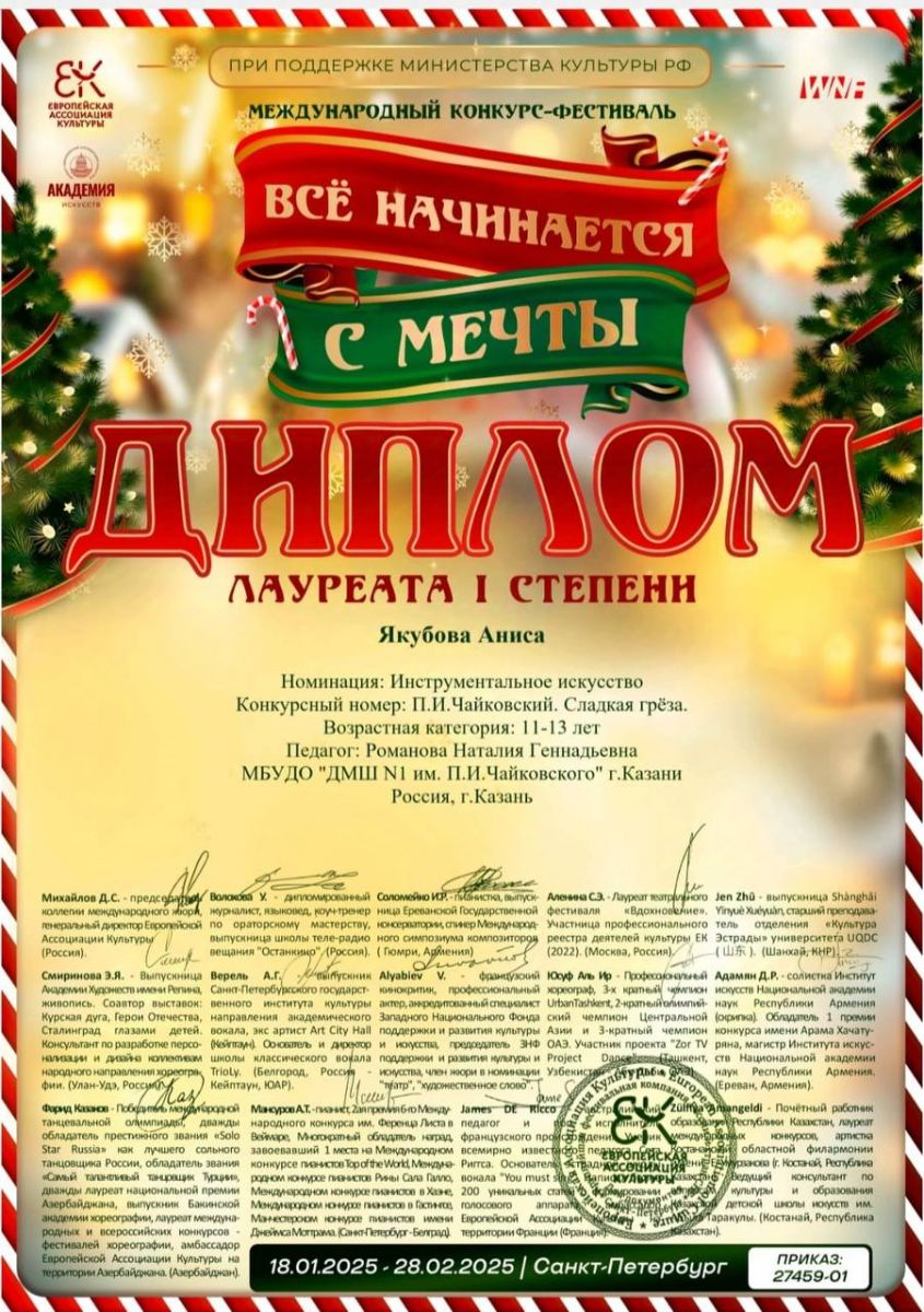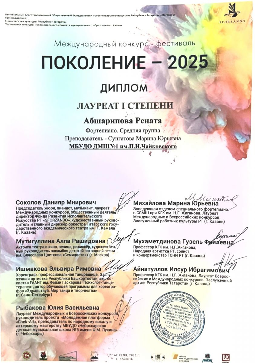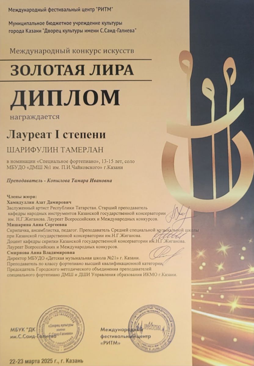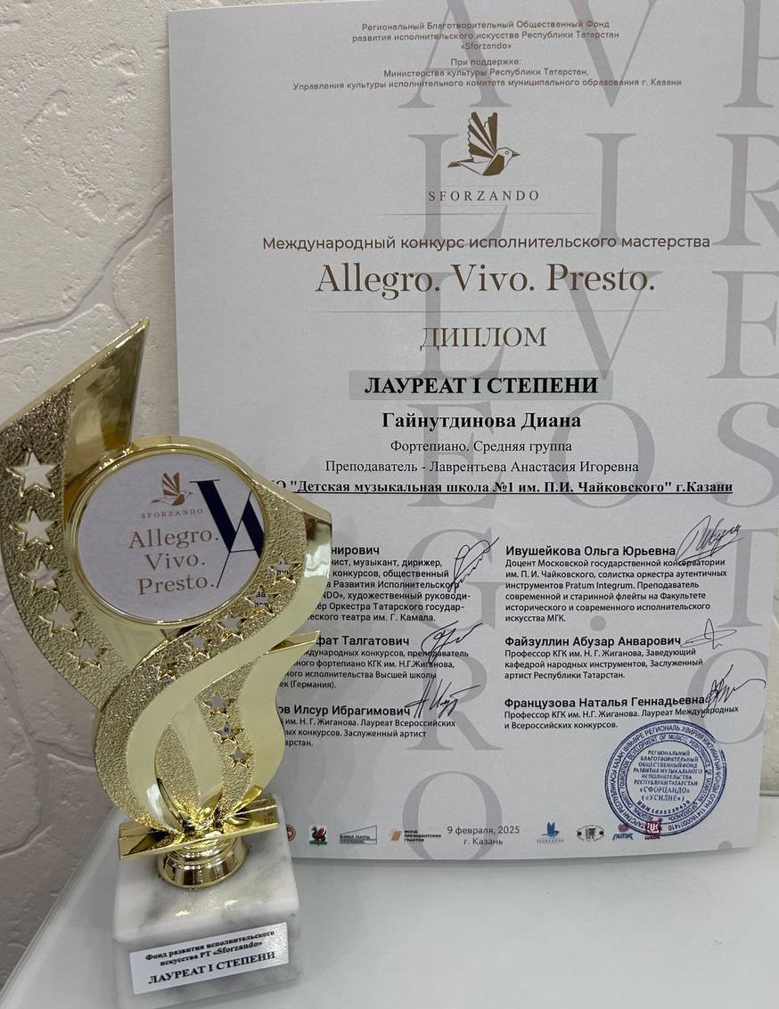 Международная музыкальная премия "Сфорцандо" - Антишина Даяна, Лауреат I степени, класс Кашаповой Г.М.;
