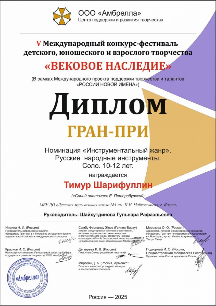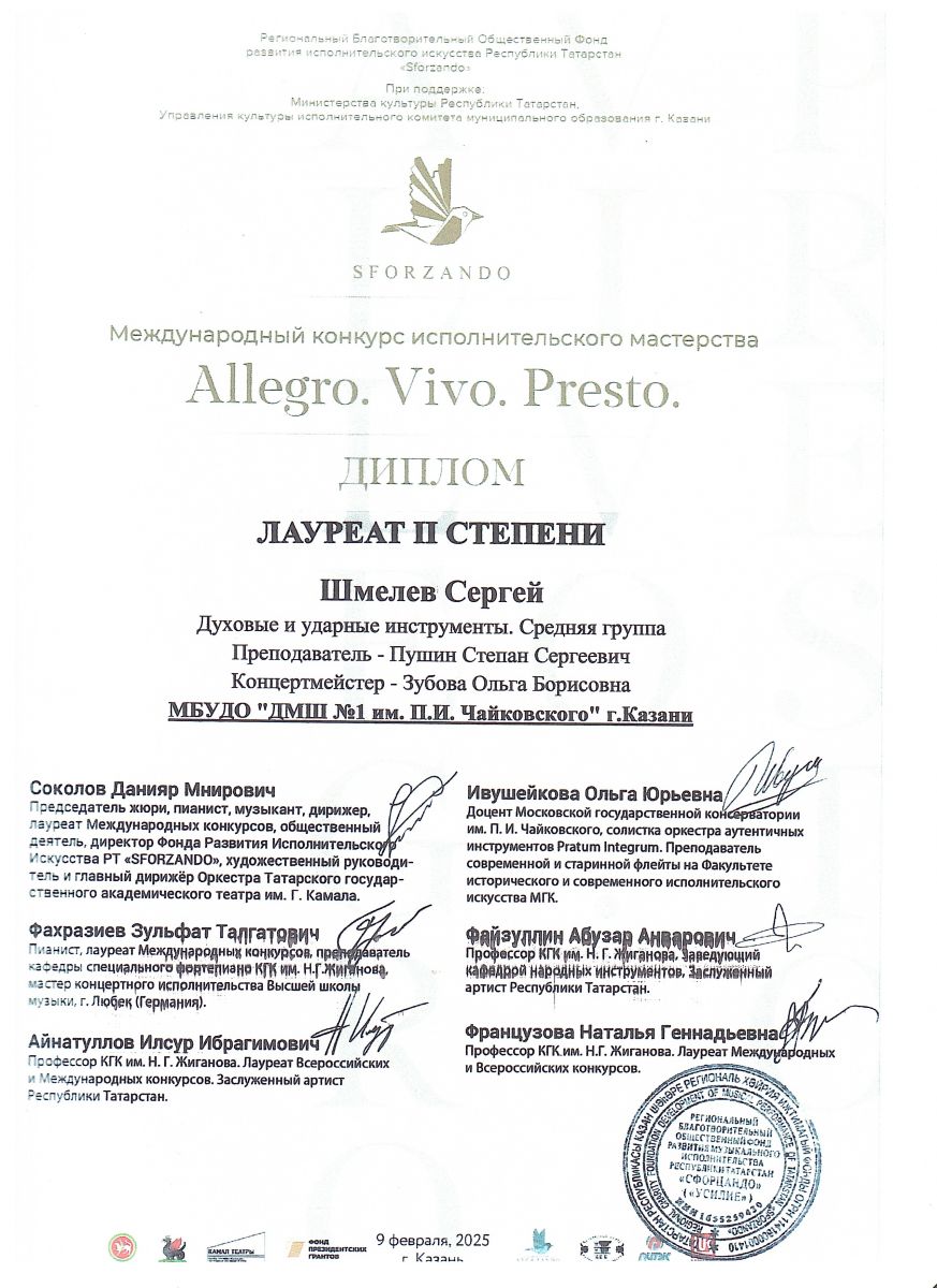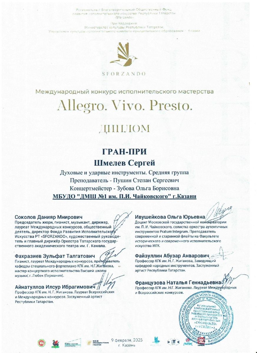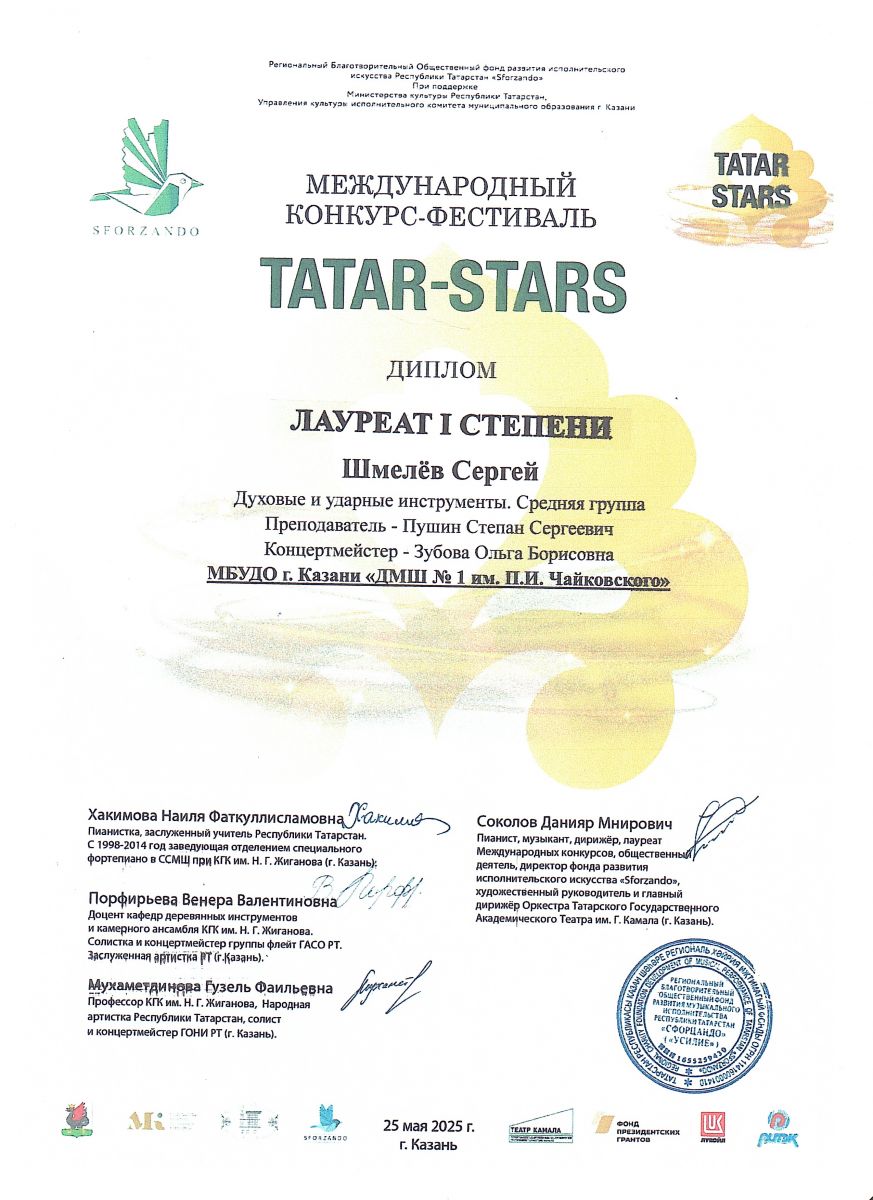 Международный конкурс-фестиваль "TATAR-STARS" - Шмелёв Сергей, Лауреат I степени, класс Пушина С.С., концертмейстер Зубова О.Б.;