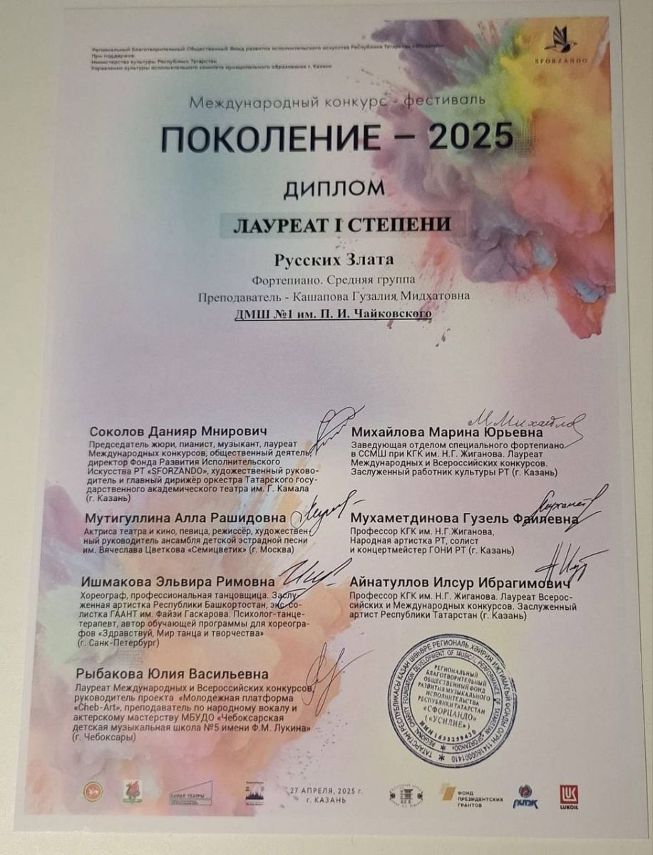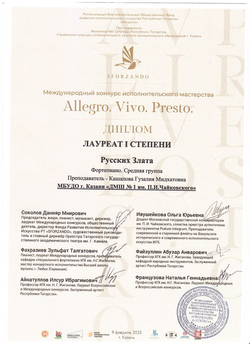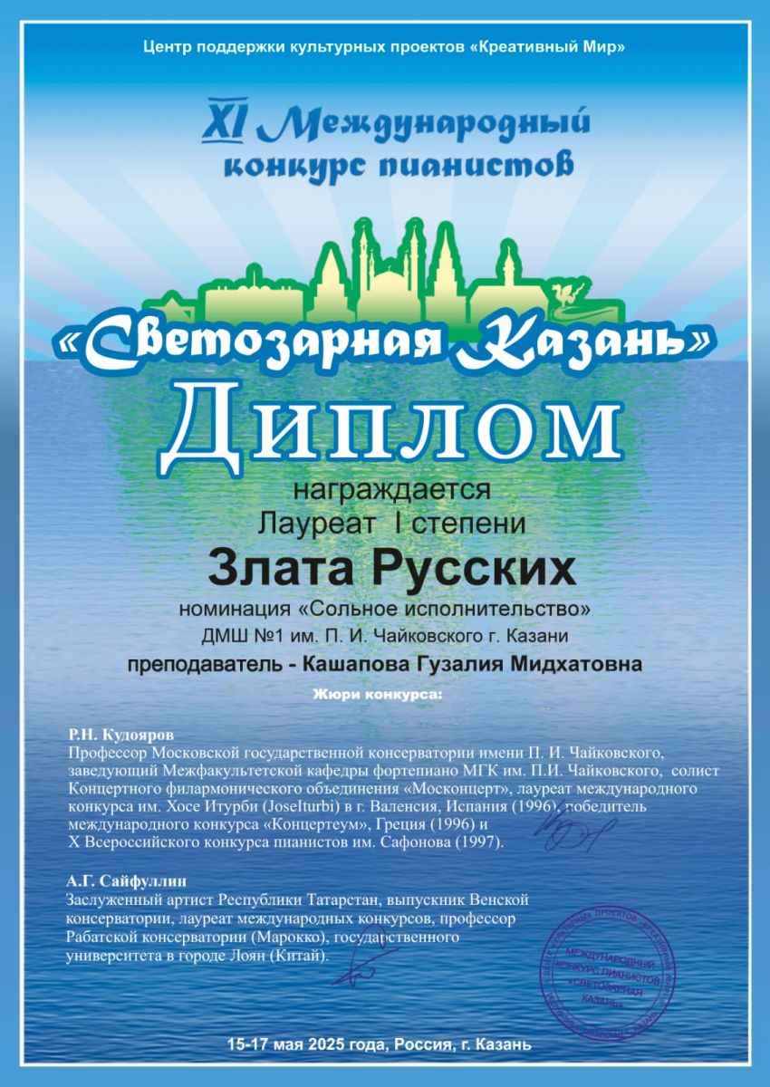 XI Международный конкурс пианистов "Светозарная Казань" - Русских Злата, Лауреат I степени, класс Кашаповой Г.М.;