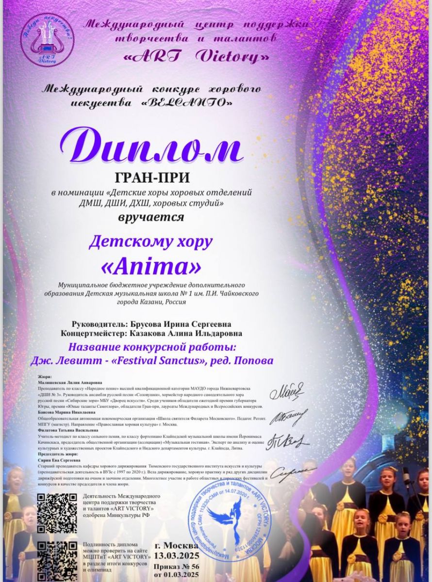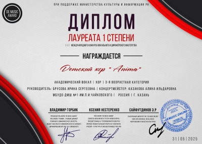 III Международный конкурс вокального и дирижёрского мастерства - Детский хор "ANIMA", Лауреат I степени, рук. Брусова И.С., концертмейстер Казакова А.И.;