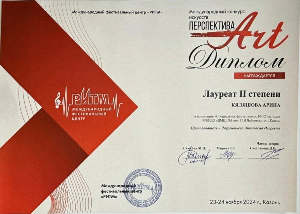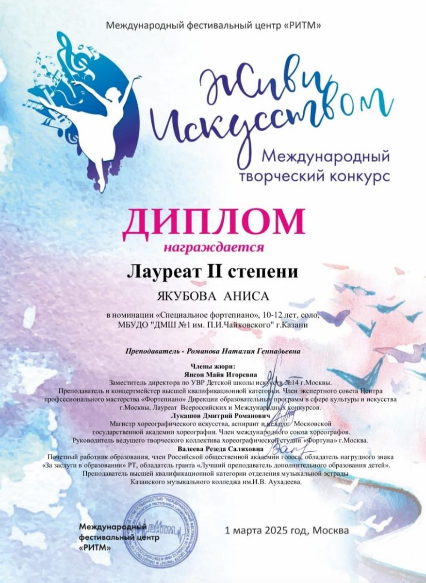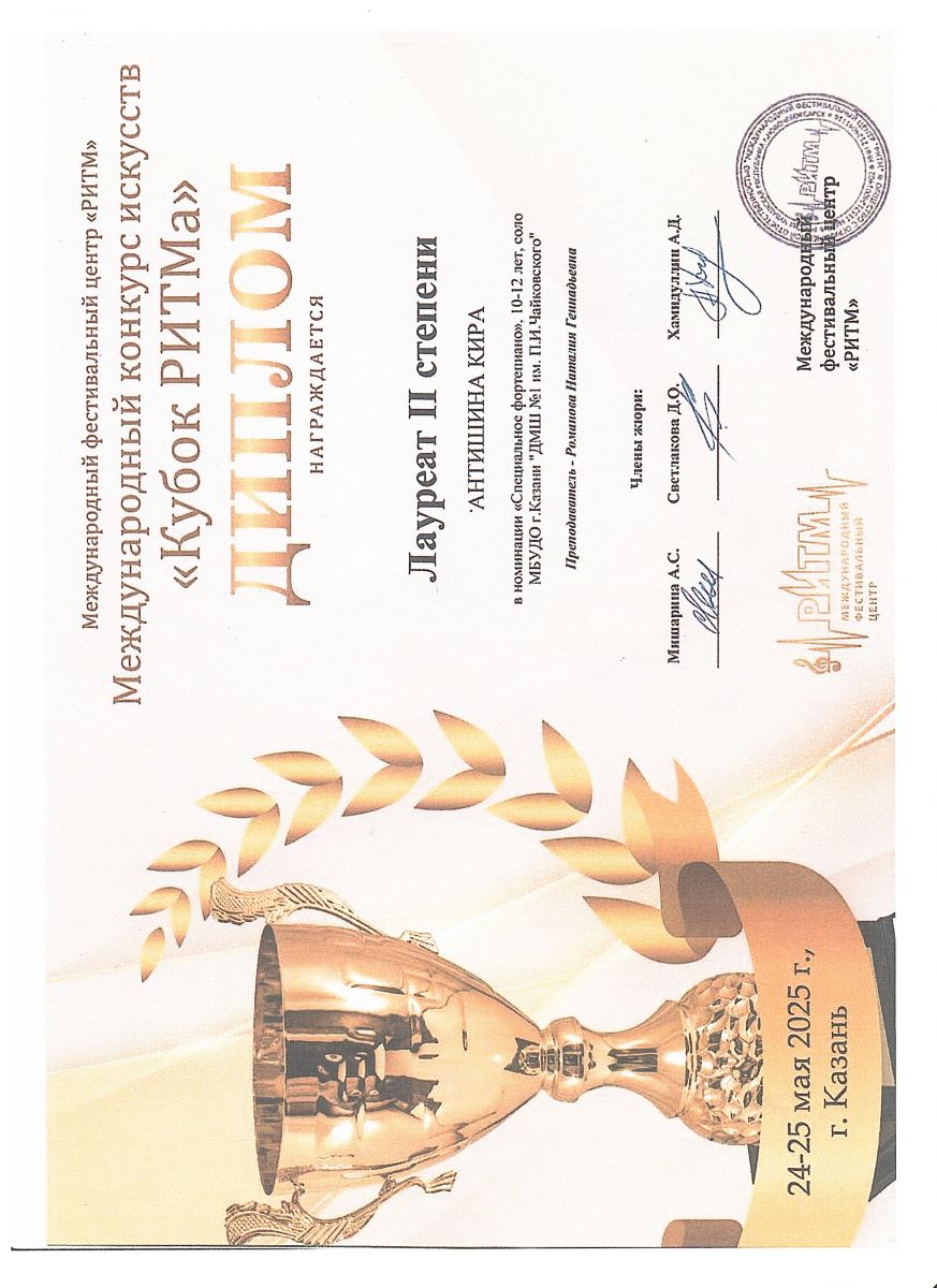 Международный конкурс искусств "Кубок РИТМа" - Антишина Кира, Лауреат II степени, класс Кашаповой Г.М.;