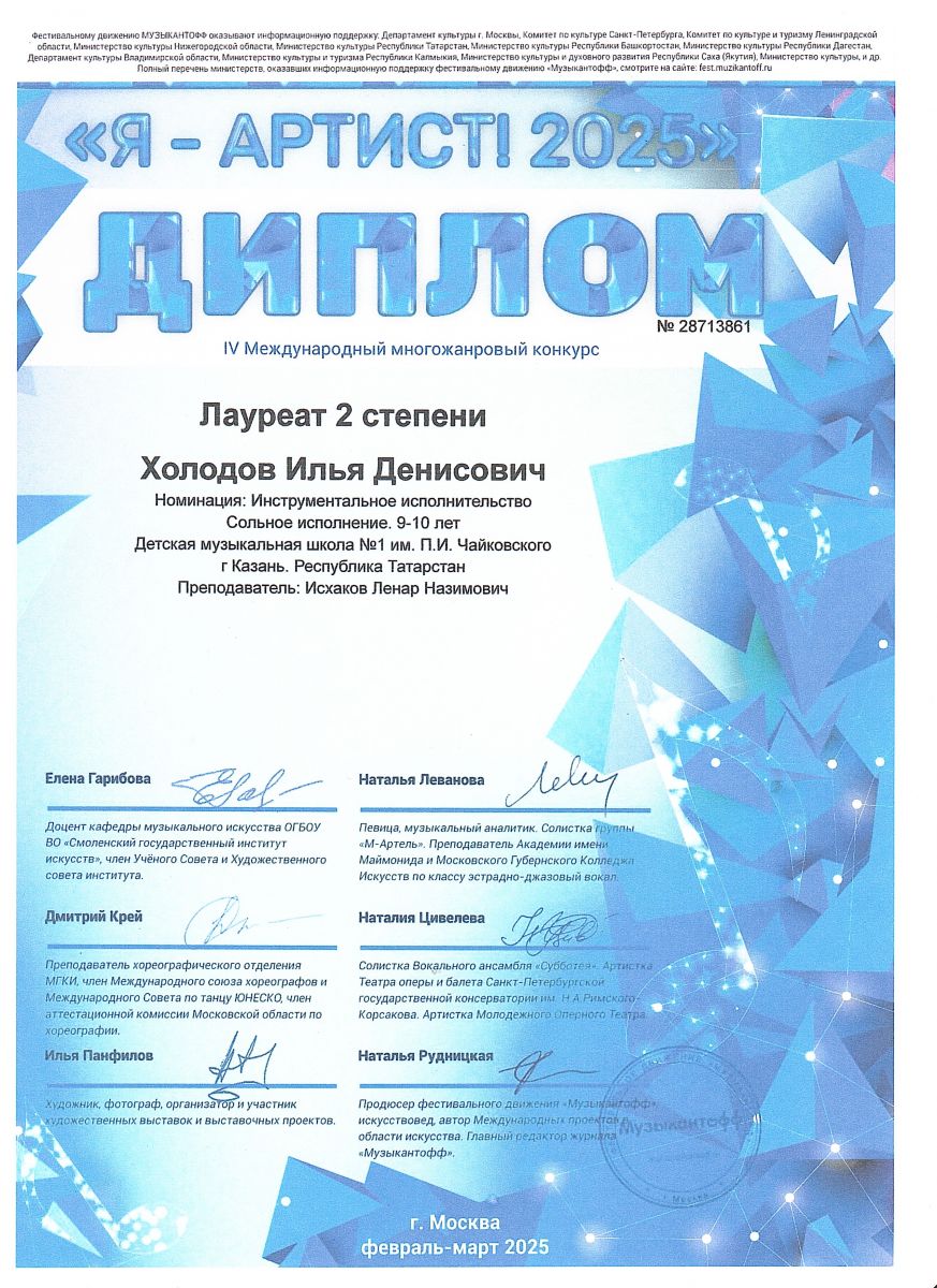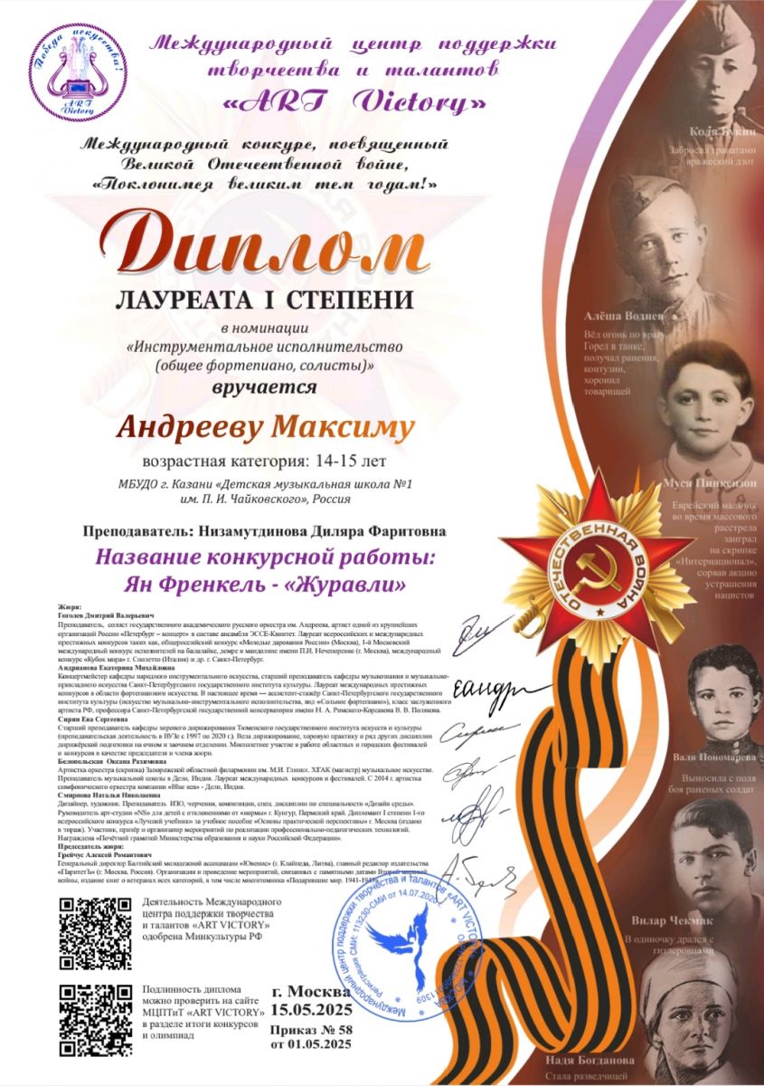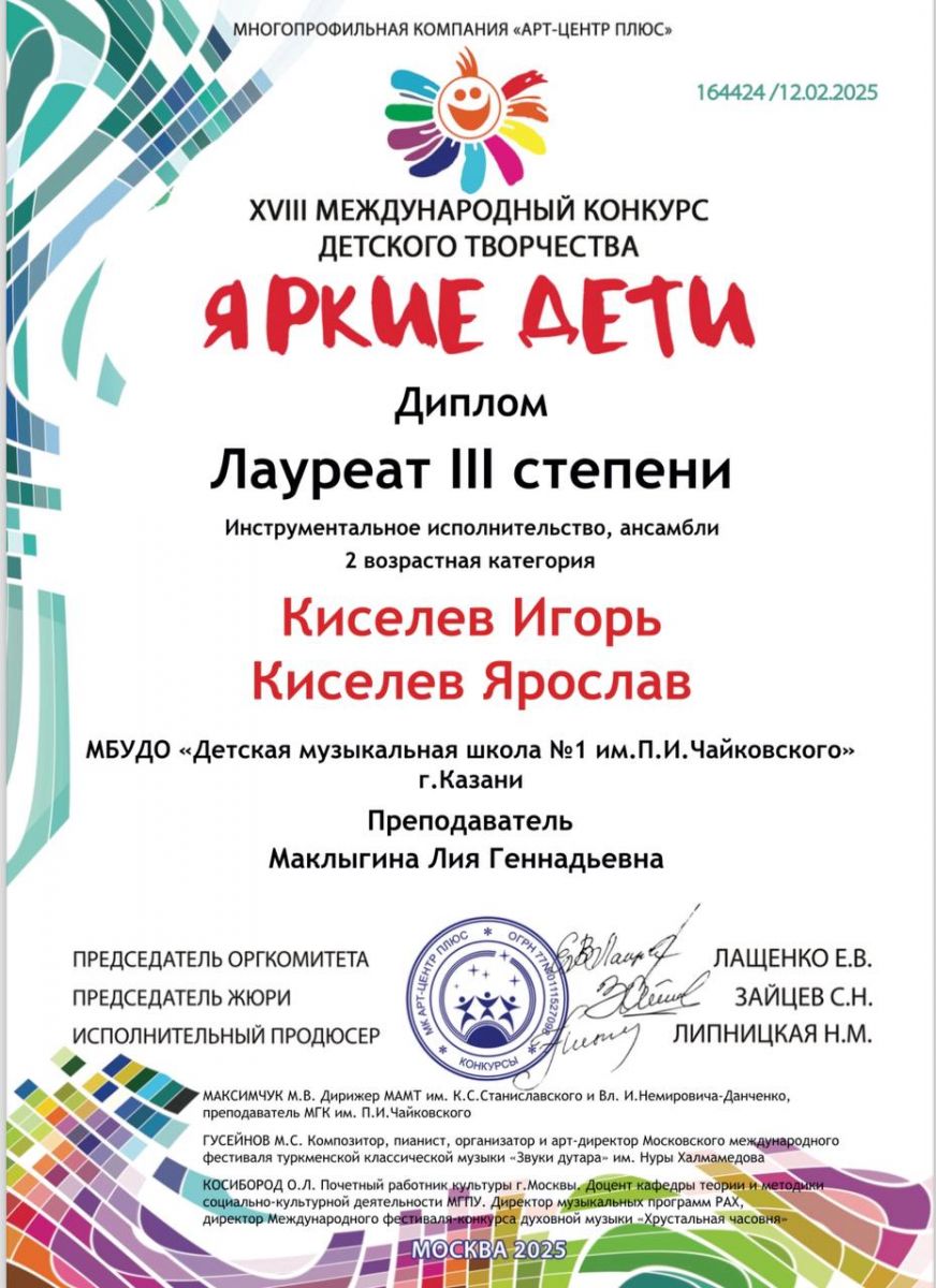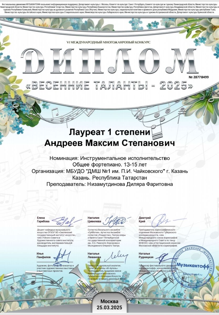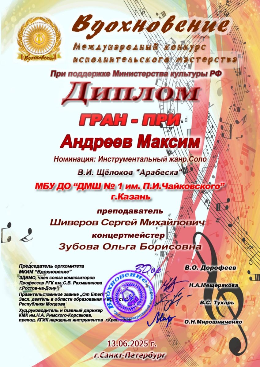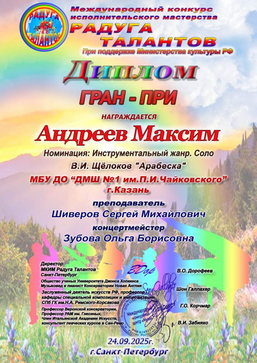 Международный конкурс исполнительского мастерства "Радуга талантов" - Андреев Максим, ГРАН-ПРИ, класс Шиверова С.М., концертмейстер Зубова О.Б.;