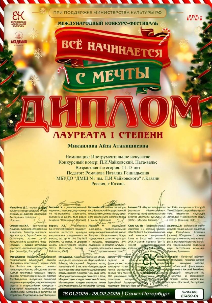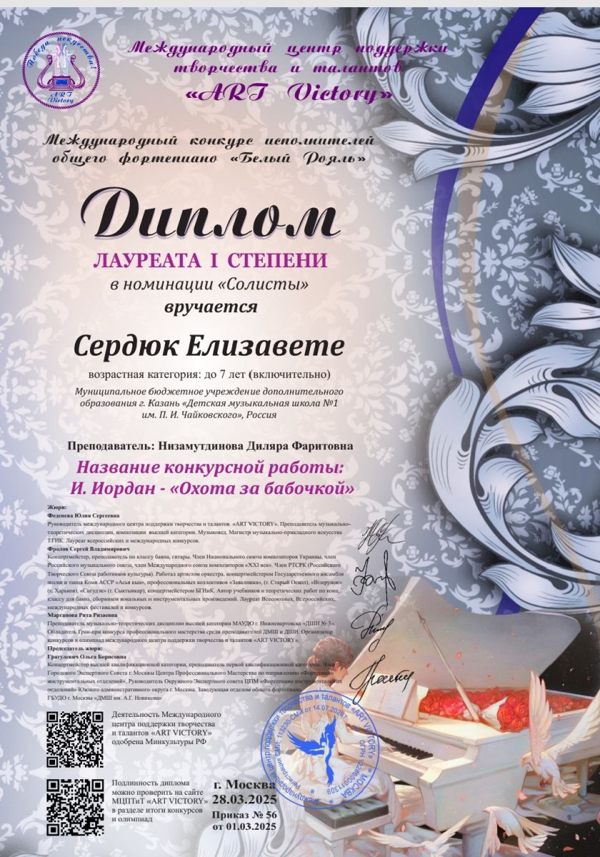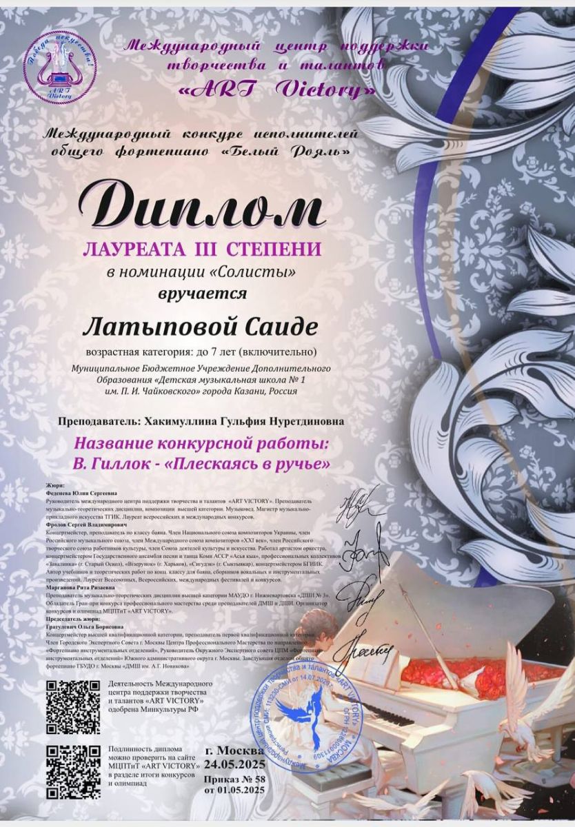 Международный конкурс исполнителей общего фортепиано "Белый рояль" - Латыпова Саида, Лауреат III степени, класс Хакимуллиной Г.Н.;