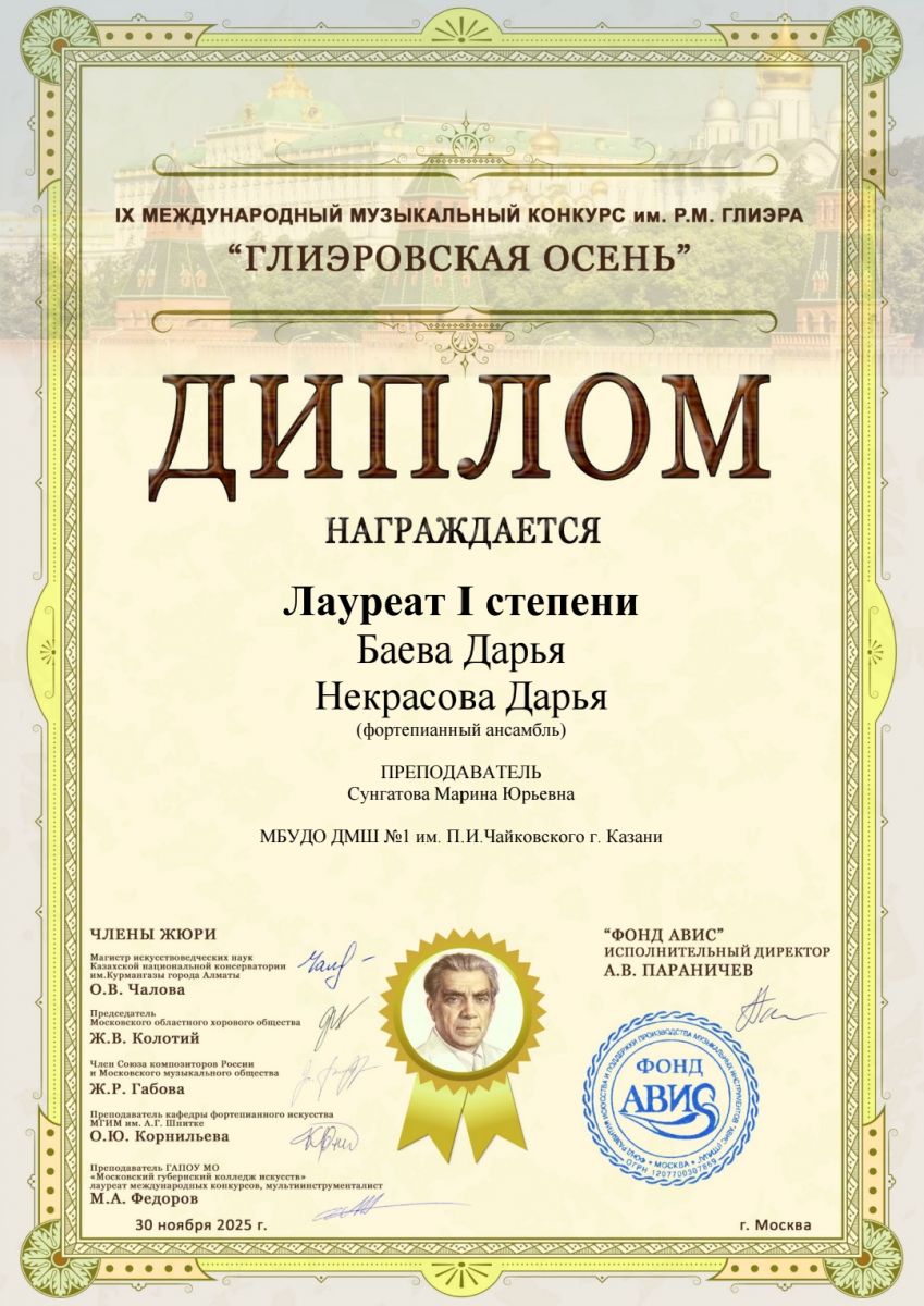 IX Международный музыкальный конкурс им. Р.М. Глиера - Баева Дарья и Некрасова Дарья, Лауреаты I степени, класс Сунгатовой М.Ю.;
