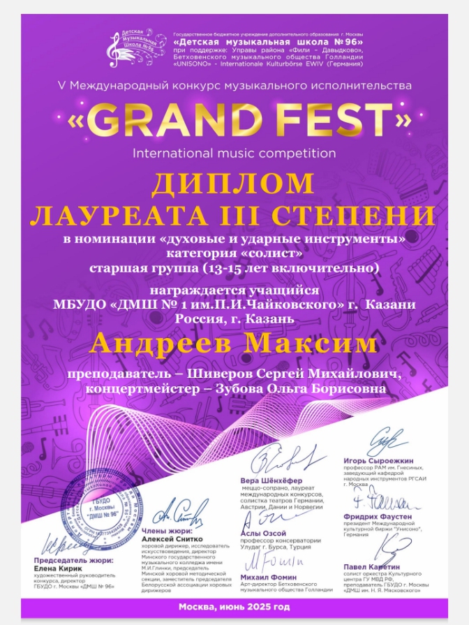 V Международный конкурс музыкального исполнительства "GRAND FEST" - Андреев Максим, Лауреат III степени, класс Шиверова С.М., концертмейстер Зубова О.Б.;