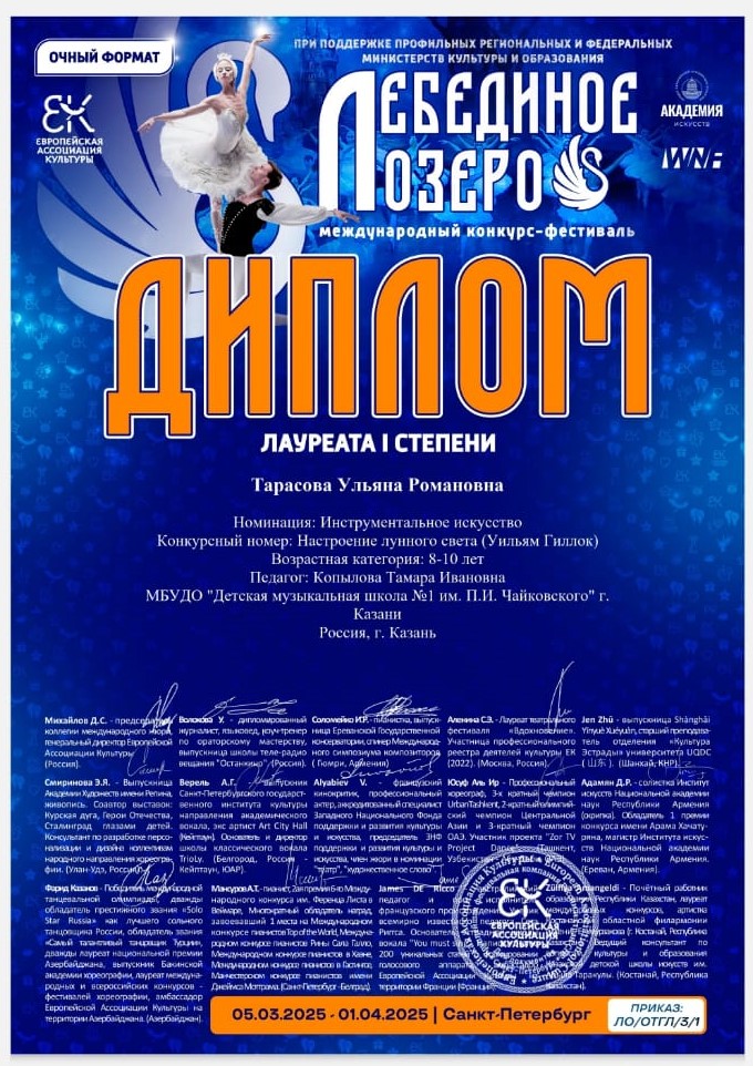 Международный конкурс-фестиваль "TATAR-STARS" - Тарасова Ульяна, Лауреат I степени, класс Копыловой Т.И.;