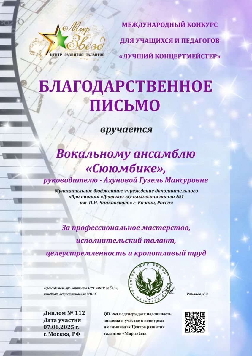 Международный конкурс для учащихся и педагогов  "Лучший концертмейстер" - Вокальный ансамбль "Сююмбике", Благодарственное письмо, рук. Ахунова Г.М., концертмейстер Сунгатова М.Ю.;