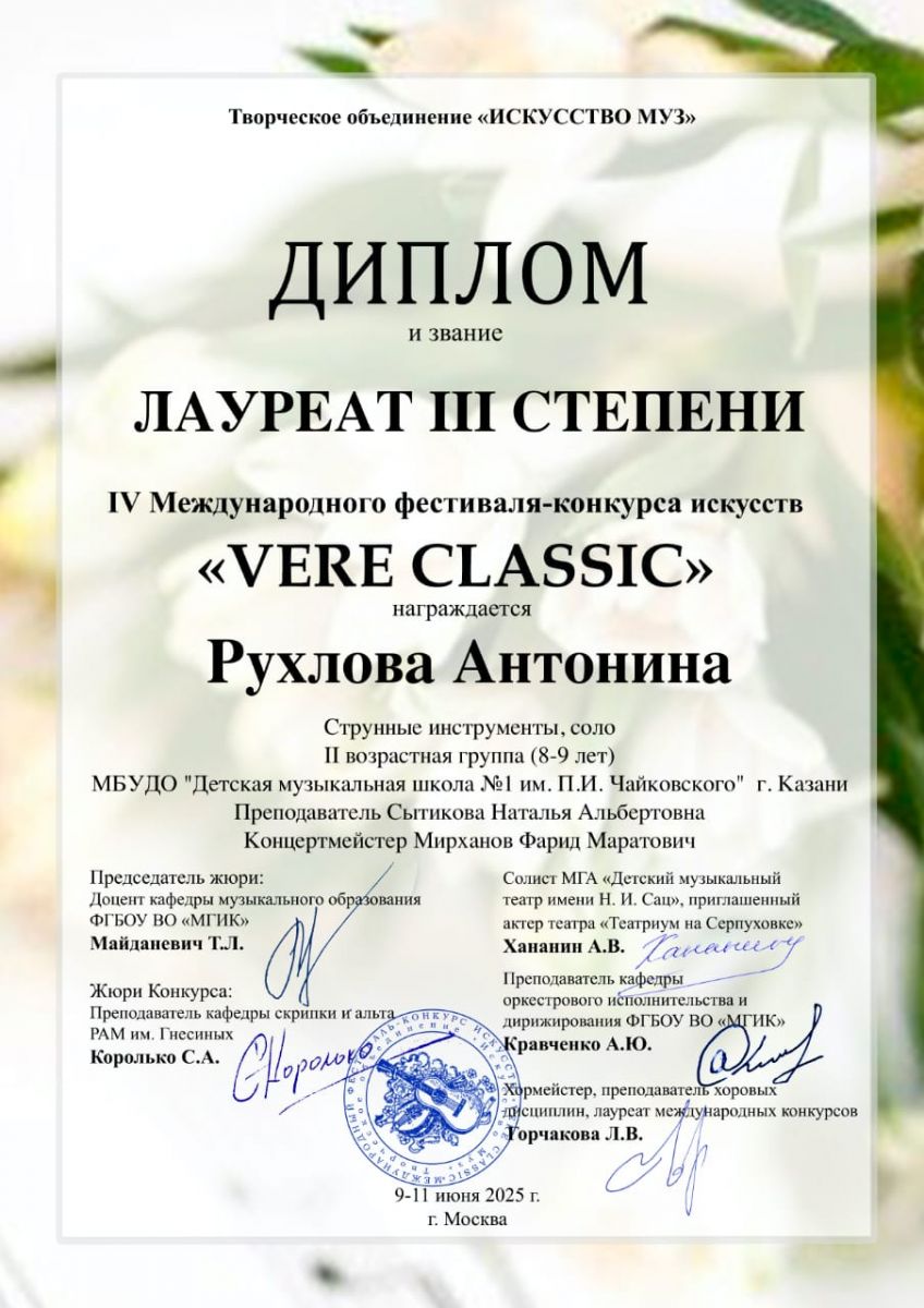 IV Международный фестиваль-конкурс искусств "VERE CLASSIC" - Рухлова Антонина, Лауреат III степени, класс Сытиковой Н.А., концертмейстер Мирханов Ф.М.;