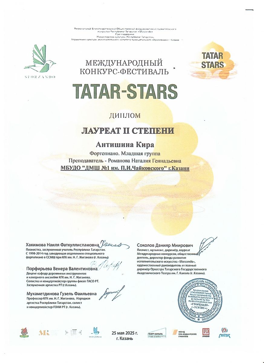 Международный конкурс-фестиваль "TATAR-STARS" - Антишина Кира, Лауреат II степени, класс Романовой Н.Г.;