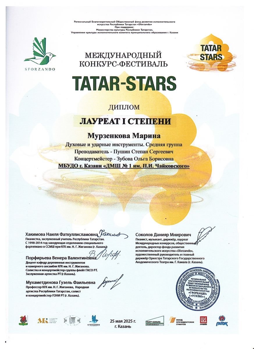 Международный конкурс-фестиваль "TATAR-STARS" - Мурзенкова Марина, Лауреат I степени, класс Пушина С.С., концертмейстер Зубова О.Б.;