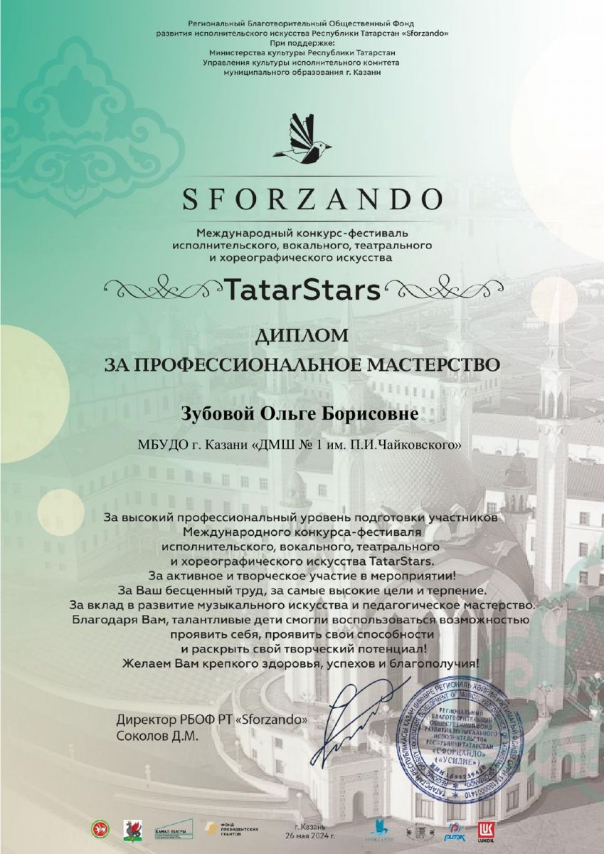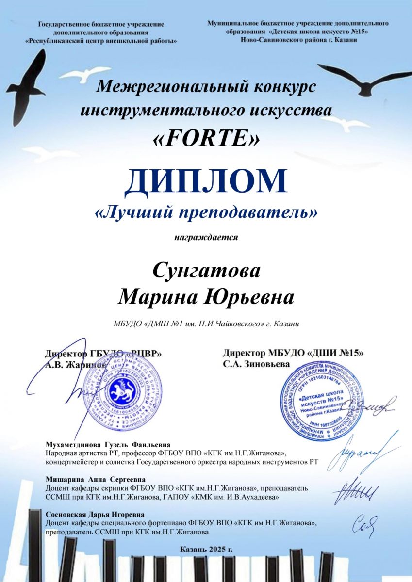 Межрегиональный конкурс музыкального искусства "Forte"- Лучший преподаватель Сунгатова М.Ю.;