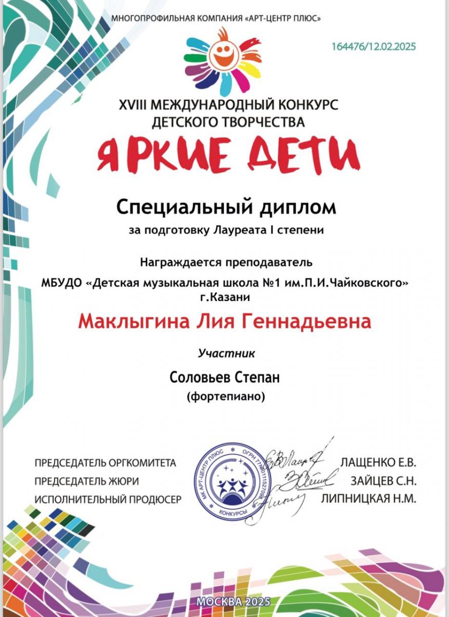 XVIII Международный конкурс детского творчества "Яркие дети" - Специальный Диплом Маклыгиной Л.Г.;