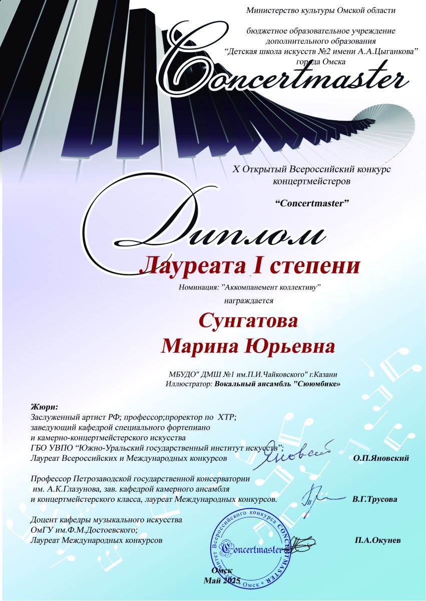 X Всероссийский конкурс концертмейстеров "Concertmaster" - Сунгатова М.Ю., Лауреат I степени;