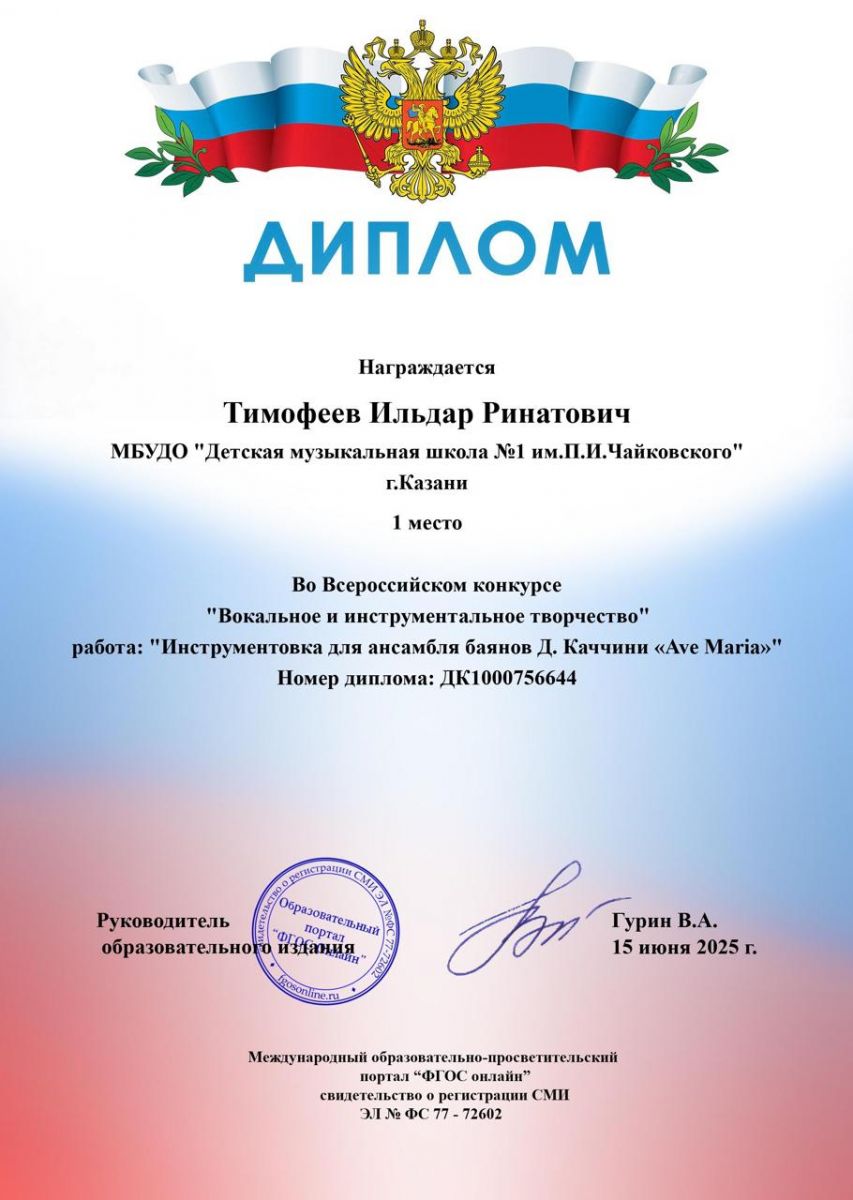 Всероссийский конкурс "Вокальное и инструментальное творчество" - Тимофеев И.Р., I место