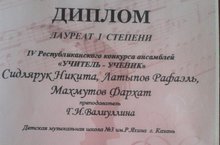 Дипломат I степени: Сулейманова Асия (класс преподпватель Гарипов Р.Н. концертмейстер Зарипова С.Н.)