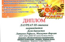 Поздравляем лауреатов III степени VI Международного конкурс-фестиваля детско-юношевского и молодежного творчества "Виктория" Латыпова Рафаэля и Махмутова Фархата кл.преп. Валиуллиной Г.И.