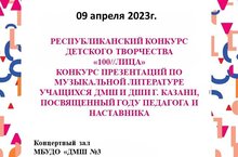 Важно! Республиканский конкурс детского творчества "100//ЛИЦА" - конкурс презентаций по музыкальной литературе переносится на 09 апреля 2023 года. Заявки принимаются до 01 апреля 2023 года.