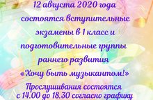 12 августа 2020 года состоятся вступительные экзамены в 1 класс и подготовительные группы раннего развития «Хочу быть музыкантом!»