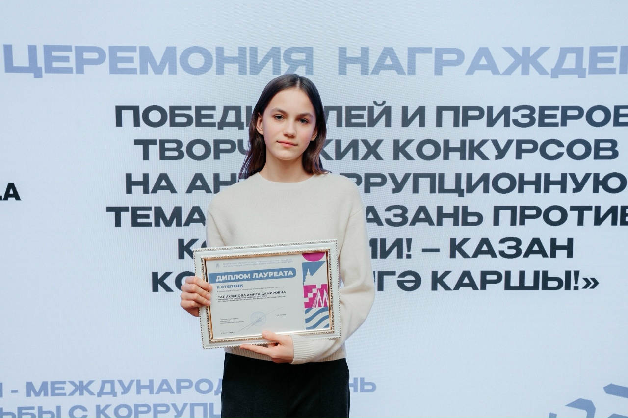 Ученица пятого класса Салихзянова Амита стала лауреатом 2 степени в номинации «Лучший плакат на антикоррупционную тему» и была удостоена денежной премии