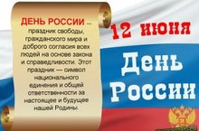 12 июня ( годовщина принятия Декларации о государственном суверенитете РСФСР) - День России. Именно так официально называется праздник с 1 февраля 2002 года.День России — праздник свободы, гражданского мира и доброго согласия всех людей на основе закона и справедливости. Этот праздник — символ национального единения и общей ответственности за настоящее и будущее нашей Родины.