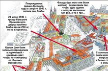 А знаете ли вы, что за первые 30 дней войны Московский Кремль «исчез» с лица Москвы? Наверное фашистские асы были немало удивлены тем, что их карты врут, и они не могут обнаружить Кремль, летая над Москвой. Все дело в том, что по плану маскировки звезды на башнях и кресты на соборах зачехлили, а купола соборов покрасили в черный цвет. По всему периметру Кремлевской стены построили трехмерные макеты жилых построек, за ними не просматривались зубцы.
