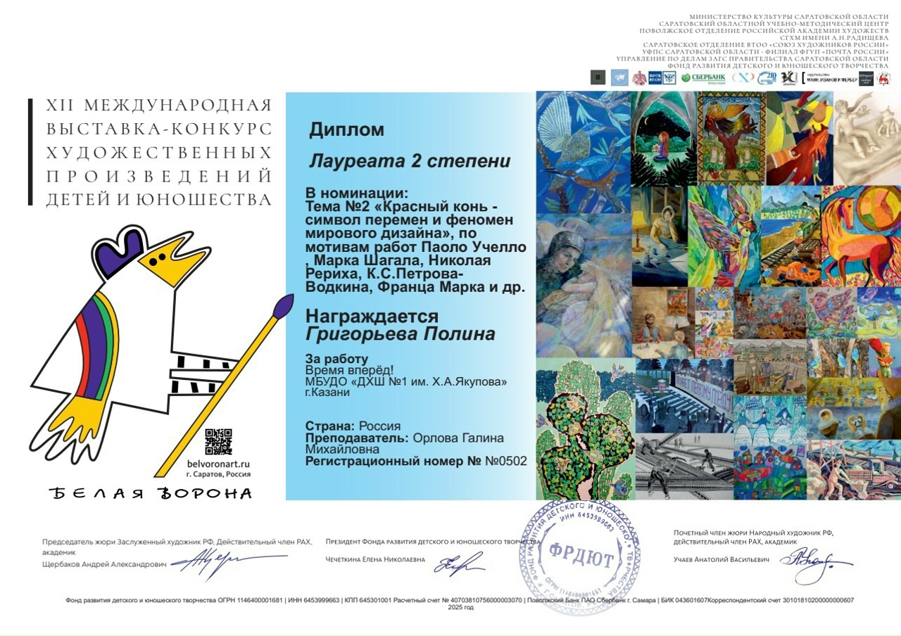 В этом году ученица нашей школы Григорьева Полина(преп.Орлова Г.М.) стала лауреатом 2 степени XII Международной выставки-конкурса художественных произведений детей и юношества «БЕЛАЯ ВОРОНА». Поздравляем
