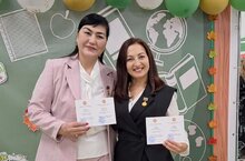 Педагоги дополнительного образования Сильвия Николаевна Чаркина и Нургул Замзамовна Раиимбаева на заседании августовской коныренции работников образования получили Нагрудный знак "За сохоранение и развитие языков, традиций и культур".