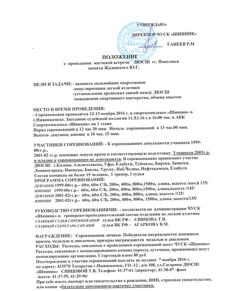 с 12-13 ноября в спорткомплексе "Шинник" в г. Нижнекамске пройдет матчевая встреча ДЮСШ городов Поволжья памяти Ю.Г. Жадовского