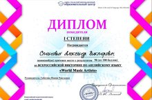 Наш студент 3 курса, группы 38-01 Становых Александр Викторович под руководством преподавателя английского языка Габитовой Фании Равгаевны участвовал во Всероссийской викторине по английскому языку «World Music Artists», проводивший Южно-уральский инновационный образовательный центр (ЮУИОЦ) В заданиях Викторины было уделено внимание проверке: словарного состава языка учащегося; умений самостоятельной познавательной деятельности в языковой сфере; библиографических знаний, умений работы с тематическими публикациями, культурными источниками музыкального искусства; специфических языковых навыков. Целью Викторины была развитие у участников познавательных способностей в предметной области «Английский язык», повышение культурной осведомленности.