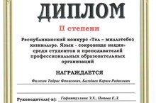 19 мая 2021 года на базе ГАПОУ «Нижнекамский многопрофильный колледж» прошел Республиканский конкурс «Тел - милләтебез хәзинәләре. Язык – сокровище нации» среди студентов и преподавателей профессиональных образовательных организаций». Студенты нашего колледжа Фаляхов Табрис Фанисович и Багавиев Карима Радиковича под руководством Гафиятуллиной Энже Хабибулловной и Поповой Евгении Леонидовны принял участие в конкурсе и заняли 2 место в Художественном конкурсе «Дружное соцветие Татарстана». Желаем не останавливаться на этой победе, идти вперед и достигать новых целей.