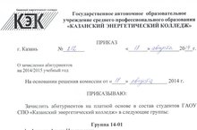 Зачислить абитуриентов на платной основе в состав студентов ГАОУ СПО "Казанский энергетический колледж" в следующие группы: