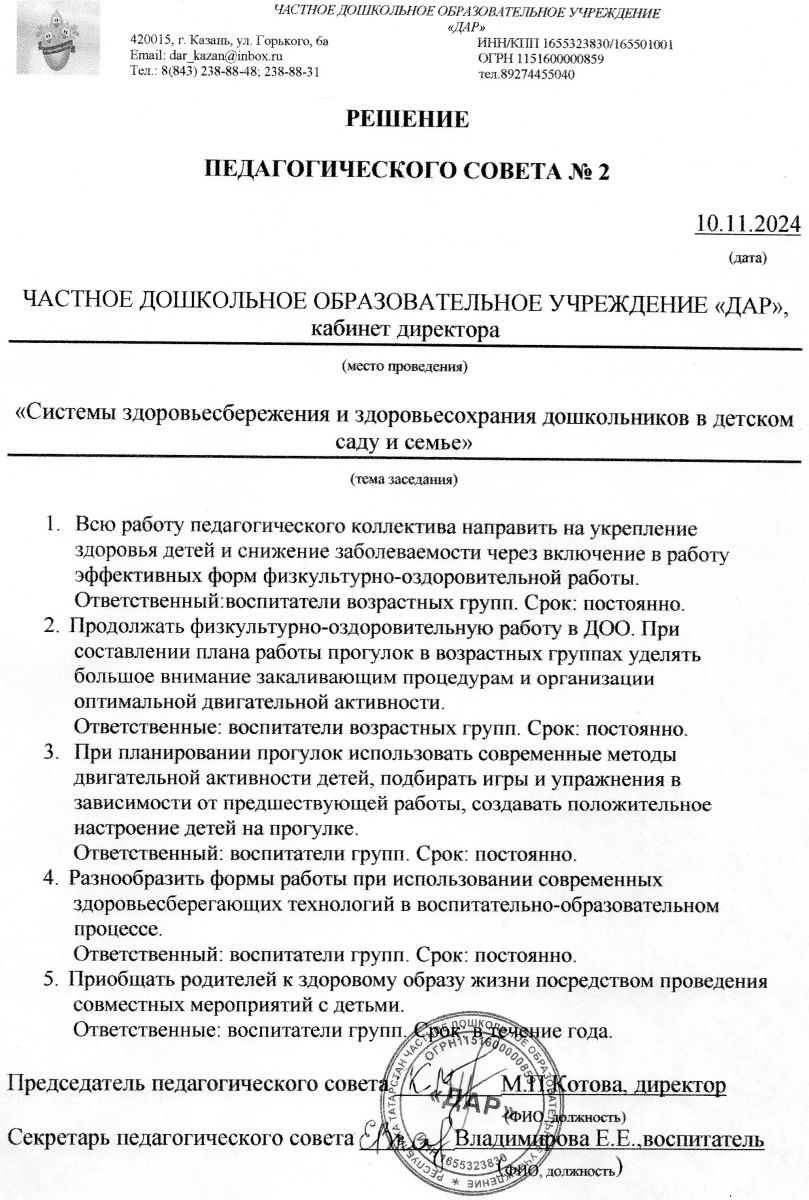 Решение педагогического совета ЧДОУ "ДАР" № 2