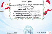 "Яңа ел әкияткә чакыра" бәйгесенең " Күләмле эшләр" номинациясендә I урынны алган гимназиябез укучысы С. Золинны һәм җитәкчесе Э.Д. Йосыпованы уңышлары белән котлыйбыз!