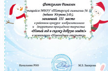 "Яңа ел әкияткә чакыра" бәйгесенең "Яңа ел открыткасы" номинациясендә III урынны алган укучыбыз Фәтхуллин Рамазанны һәм җитәкчесе Э. Д. Йосыповнаны уңышлары белән котлыйбыз!