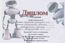 «Кегль – ринг: квадро» номинациясендә робототехника буенча уздырылган “Сумо” шәһәркүләм II ярышында 1нче урынны яулап, 1нче дәрәҗә дипломга лаек булган гимназия командасын – Е. Алигулиева, Ч . Хәбибуллин һәм җитәкчеләре Р.Р. Баһаутдинованы җиңүләре белән котлыйбыз!